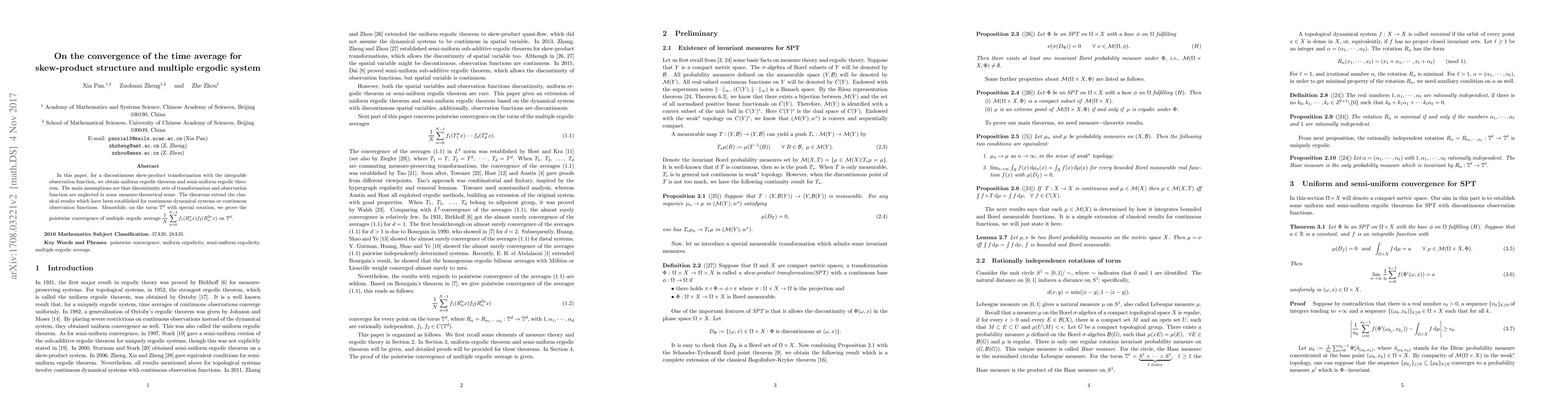 In this paper, for a discontinuous skew-product transformation with the integrable observation function, we obtain uniform ergodic theorem and semi-uniform ergodic theorem. The main assumptions are that discontinuity sets of transformation and observation function are neglected in some measure-theoretical sense. The theorems extend the classical results which have been established for continuous dynamical systems or continuous observation functions. Meanwhile, on the torus $\mathbb{T}^{d}$ with special rotation, we prove the pointwise convergence of multiple ergodic average $\disp \f 1 N \sum_{n=0}^{N-1} f_{1}(R_{\alpha}^{n}x)f_{2}(R_{\alpha}^{2n}x)$ in $\mathbb{T}^{d}$.