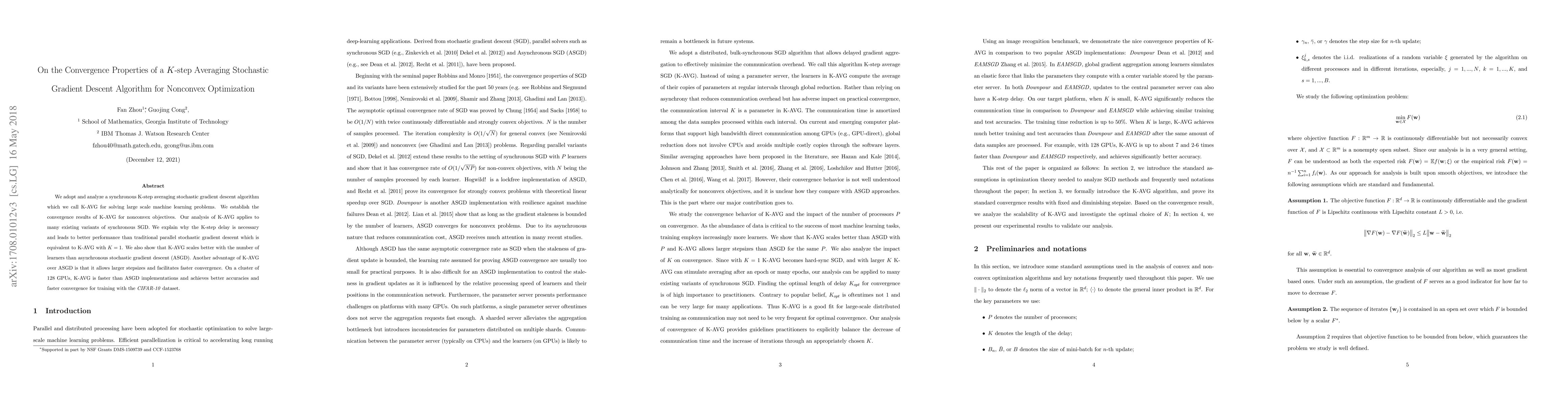 This paper analyzes a K-step averaging stochastic gradient descent algorithm (K-AVG) for nonconvex optimization, demonstrating its superior convergence properties and performance over asynchronous stochastic gradient descent (ASGD). K-AVG shows better scalability, larger stepsize tolerance, and faster convergence on large-scale machine learning tasks, as evidenced by improved accuracy and speed on a CIFAR dataset using 128 GPUs.