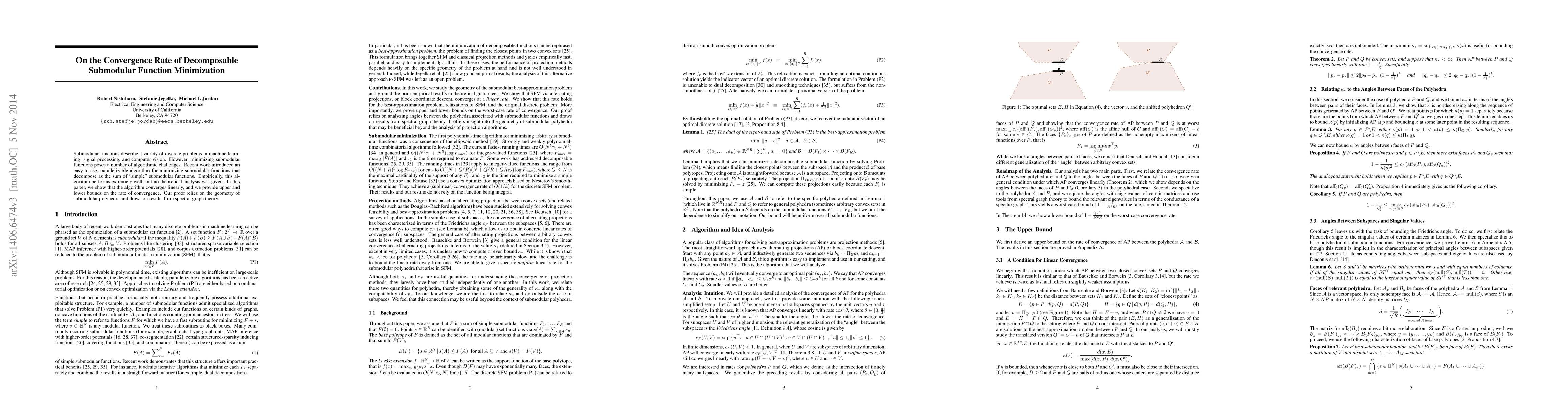 Submodular functions describe a variety of discrete problems in machine learning, signal processing, and computer vision. However, minimizing submodular functions poses a number of algorithmic challenges. Recent work introduced an easy-to-use, parallelizable algorithm for minimizing submodular functions that decompose as the sum of "simple" submodular functions. Empirically, this algorithm performs extremely well, but no theoretical analysis was given. In this paper, we show that the algorithm converges linearly, and we provide upper and lower bounds on the rate of convergence. Our proof relies on the geometry of submodular polyhedra and draws on results from spectral graph theory.