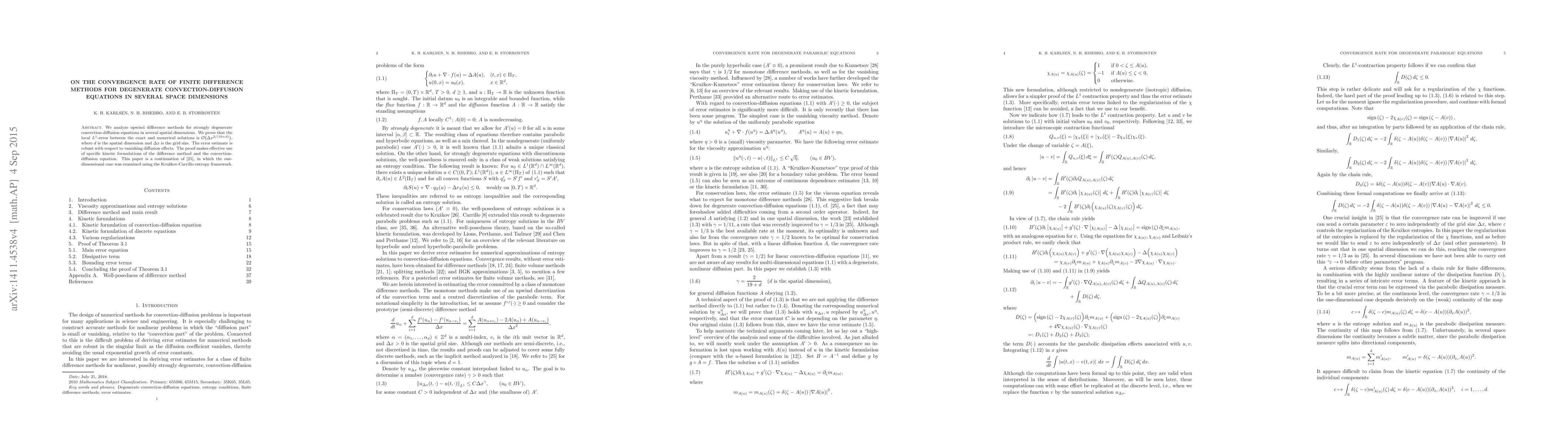 This paper investigates the convergence rate of upwind difference methods for solving strongly degenerate convection-diffusion equations in multiple dimensions. The authors prove that the local $L^1$-error is $\mathcal{O}(\Delta x^{2/(19+d)})$, demonstrating robust convergence even as diffusion diminishes.