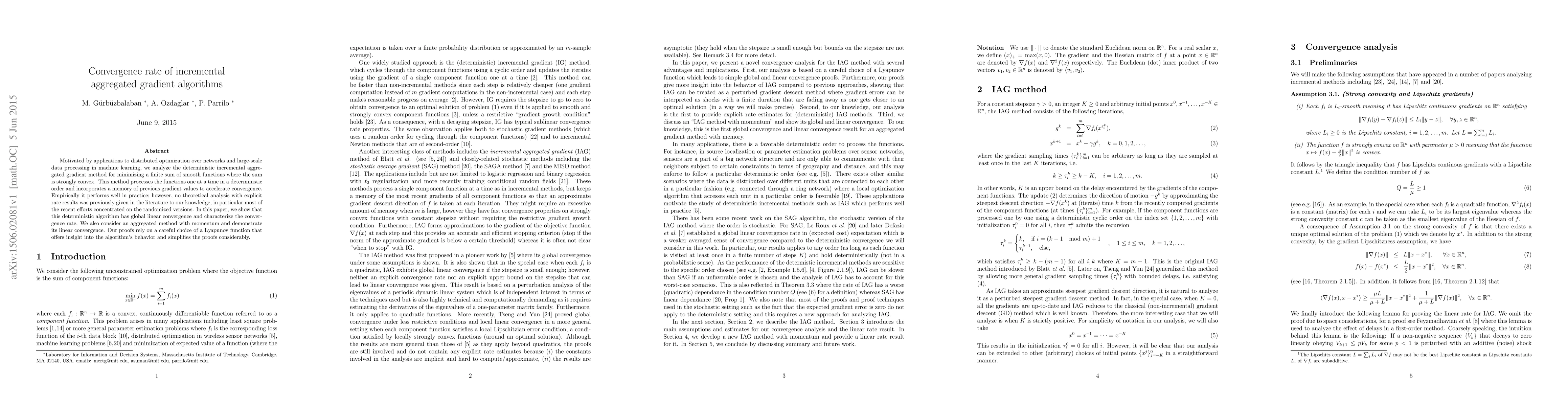 Motivated by applications to distributed optimization over networks and large-scale data processing in machine learning, we analyze the deterministic incremental aggregated gradient method for minimizing a finite sum of smooth functions where the sum is strongly convex. This method processes the functions one at a time in a deterministic order and incorporates a memory of previous gradient values to accelerate convergence. Empirically it performs well in practice; however, no theoretical analysis with explicit rate results was previously given in the literature to our knowledge, in particular most of the recent efforts concentrated on the randomized versions. In this paper, we show that this deterministic algorithm has global linear convergence and characterize the convergence rate. We also consider an aggregated method with momentum and demonstrate its linear convergence. Our proofs rely on a careful choice of a Lyapunov function that offers insight into the algorithm's behavior and simplifies the proofs considerably.