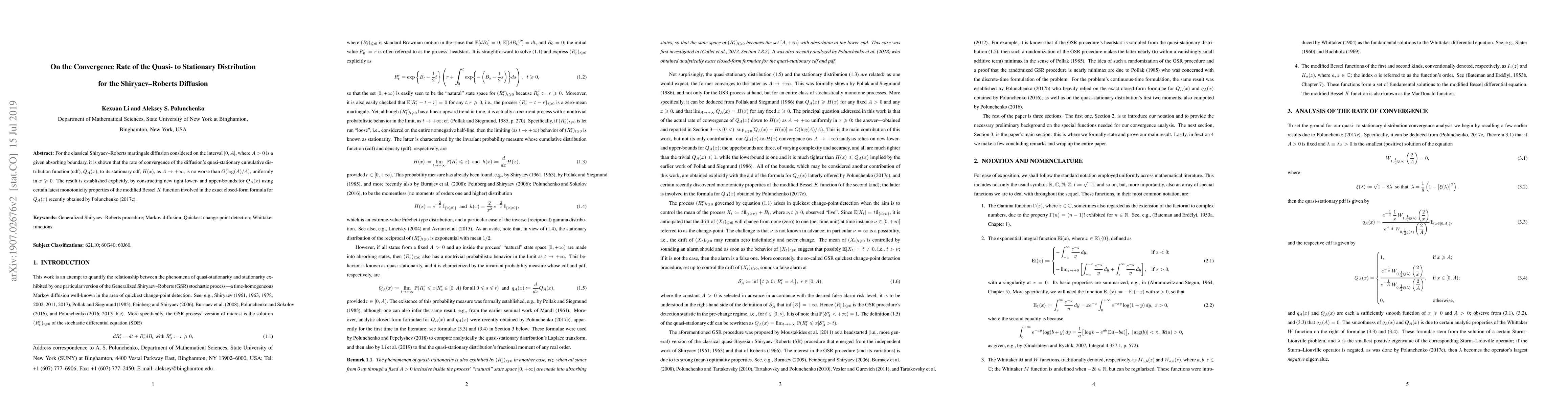 For the classical Shiryaev--Roberts martingale diffusion considered on the interval $[0,A]$, where $A>0$ is a given absorbing boundary, it is shown that the rate of convergence of the diffusion's quasi-stationary cumulative distribution function (cdf), $Q_{A}(x)$, to its stationary cdf, $H(x)$, as $A\to+\infty$, is no worse than $O(\log(A)/A)$, uniformly in $x\ge0$. The result is established explicitly, by constructing new tight lower- and upper-bounds for $Q_{A}(x)$ using certain latest monotonicity properties of the modified Bessel $K$ function involved in the exact closed-form formula for $Q_{A}(x)$ recently obtained by Polunchenko (2017).