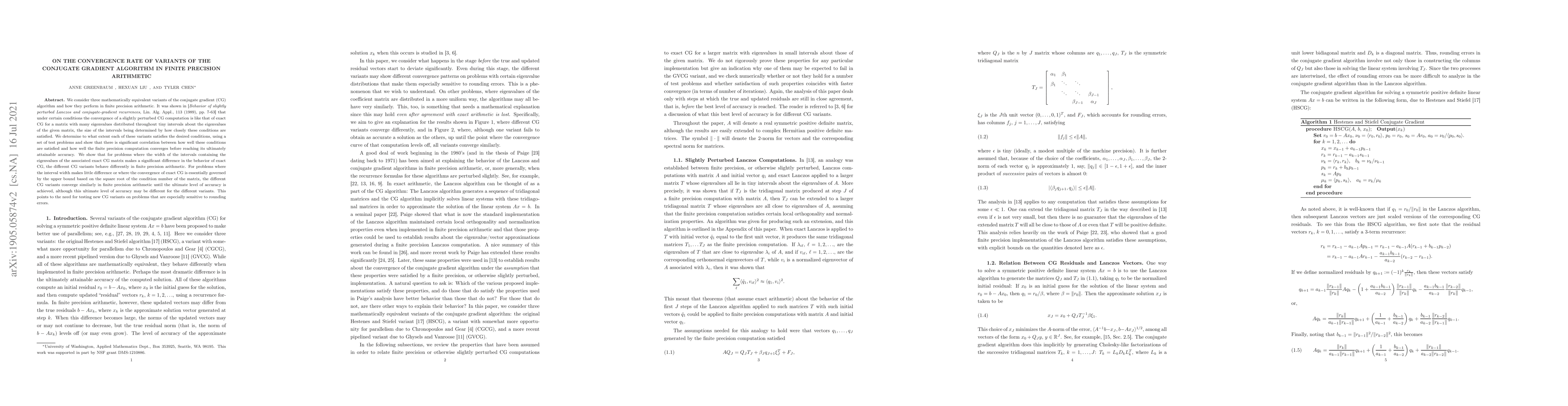 This research paper investigates the performance of variants of the conjugate gradient algorithm in finite precision arithmetic, finding that some converge faster than others depending on the matrix's eigenvalue distribution.