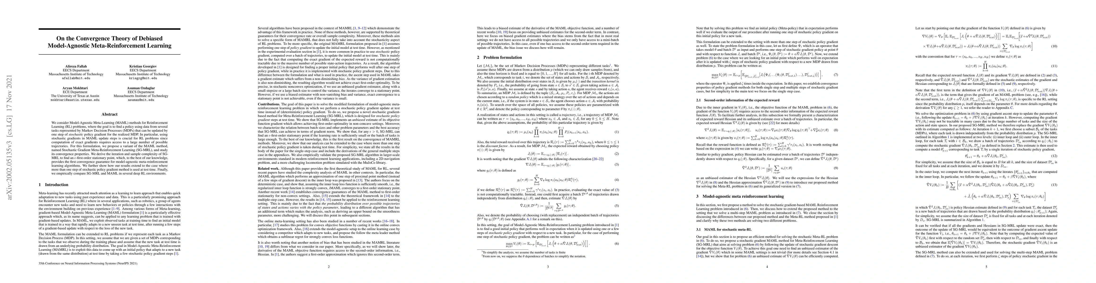 This paper proposes Stochastic Gradient Meta-Reinforcement Learning (SG-MRL), a variant of Model-Agnostic Meta-Learning (MAML) for Reinforcement Learning, and provides the first convergence guarantee for model-agnostic meta-reinforcement learning algorithms, extending results to multi-step stochastic policy gradients. Empirical comparisons in deep RL environments follow.