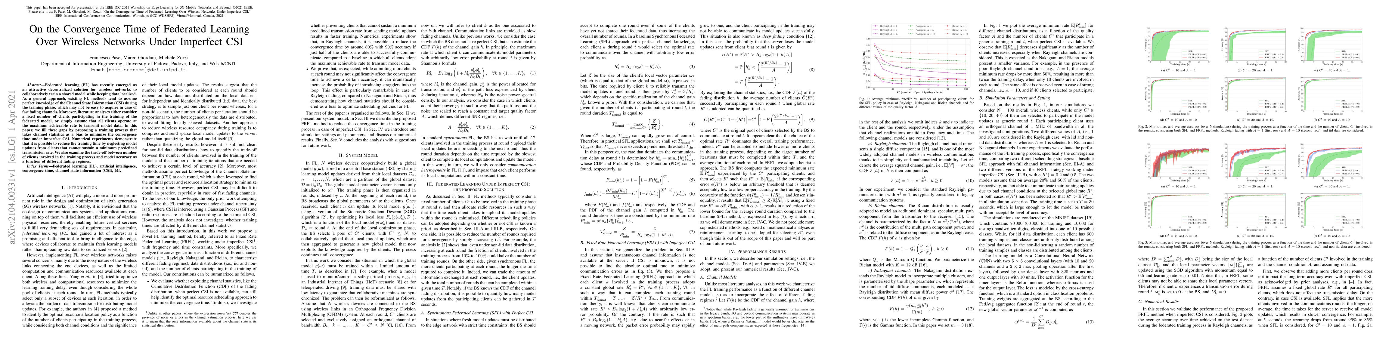 Federated learning (FL) has recently emerged as an attractive decentralized solution for wireless networks to collaboratively train a shared model while keeping data localized. As a general approach, existing FL methods tend to assume perfect knowledge of the Channel State Information (CSI) during the training phase, which may not be easy to acquire in case of fast fading channels. Moreover, literature analyses either consider a fixed number of clients participating in the training of the federated model, or simply assume that all clients operate at the maximum achievable rate to transmit model data. In this paper, we fill these gaps by proposing a training process that takes channel statistics as a bias to minimize the convergence time under imperfect CSI. Numerical experiments demonstrate that it is possible to reduce the training time by neglecting model updates from clients that cannot sustain a minimum predefined transmission rate. We also examine the trade-off between number of clients involved in the training process and model accuracy as a function of different fading regimes.
