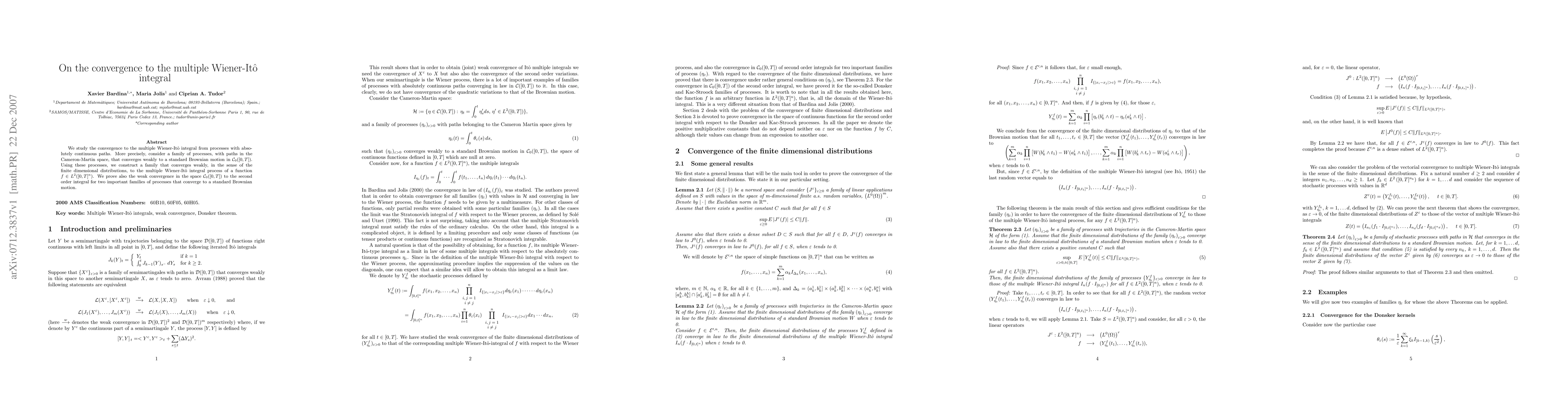We study the convergence to the multiple Wiener-It\^{o} integral from processes with absolutely continuous paths. More precisely, consider a family of processes, with paths in the Cameron-Martin space, that converges weakly to a standard Brownian motion in $\mathcal C_0([0,T])$. Using these processes, we construct a family that converges weakly, in the sense of the finite dimensional distributions, to the multiple Wiener-It\^{o} integral process of a function $f\in L^2([0,T]^n)$. We prove also the weak convergence in the space $\mathcal C_0([0,T])$ to the second order integral for two important families of processes that converge to a standard Brownian motion.