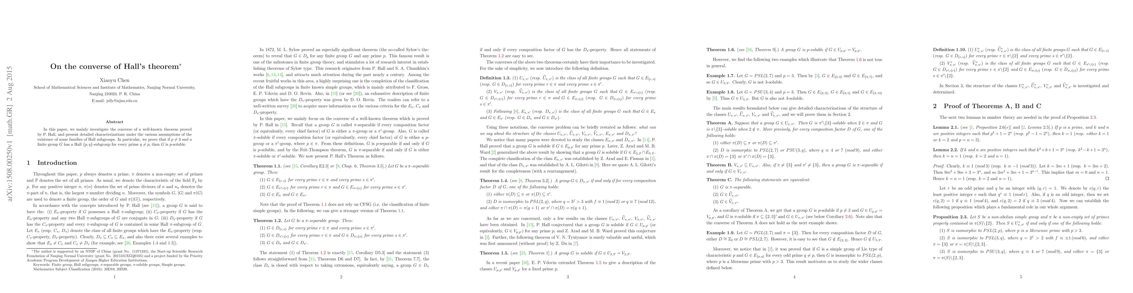 A research paper investigates the converse of Hall's theorem, proving that if a group has a Hall subgroup for every prime except p, then it is p-soluble for primes not equal to 3.