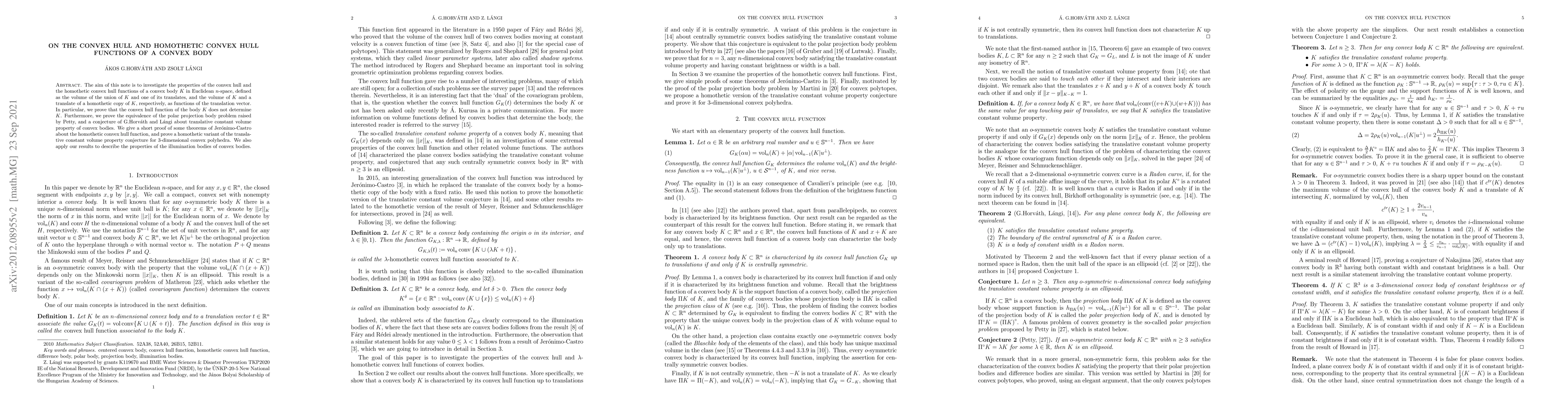 The aim of this note is to investigate the properties of the convex hull and the homothetic convex hull functions of a convex body $K$ in Euclidean $n$-space, defined as the volume of the union of $K$ and one of its translates, and the volume of $K$ and a translate of a homothetic copy of $K$, respectively, as functions of the translation vector. In particular, we prove that the convex hull function of the body $K$ does not determine $K$. Furthermore, we prove the equivalence of the polar projection body problem raised by Petty, and a conjecture of G.Horv\'ath and L\'angi about translative constant volume property of convex bodies. We give a short proof of some theorems of Jer\'onimo-Castro about the homothetic convex hull function, and prove a homothetic variant of the translative constant volume property conjecture for $3$-dimensional convex polyhedra. We also apply our results to describe the properties of the illumination bodies of convex bodies.