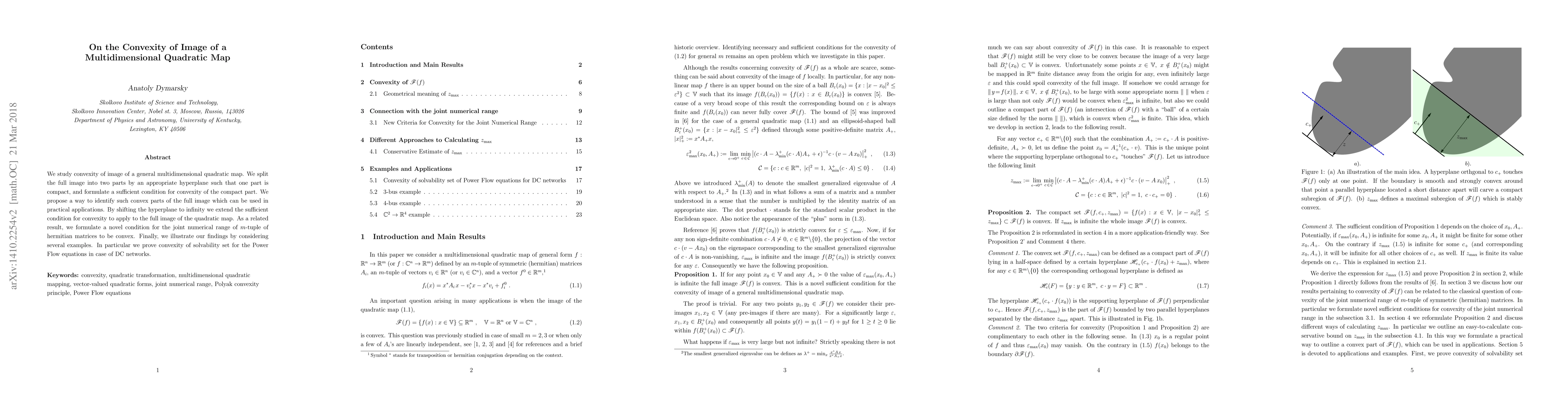 This paper explores the convexity of the image of a multidimensional quadratic map by dividing it into compact and non-compact parts, providing a sufficient condition for the convexity of the compact part. It extends this condition to the full image and applies it to practical scenarios, including the solvability set for Power Flow equations in DC networks.
