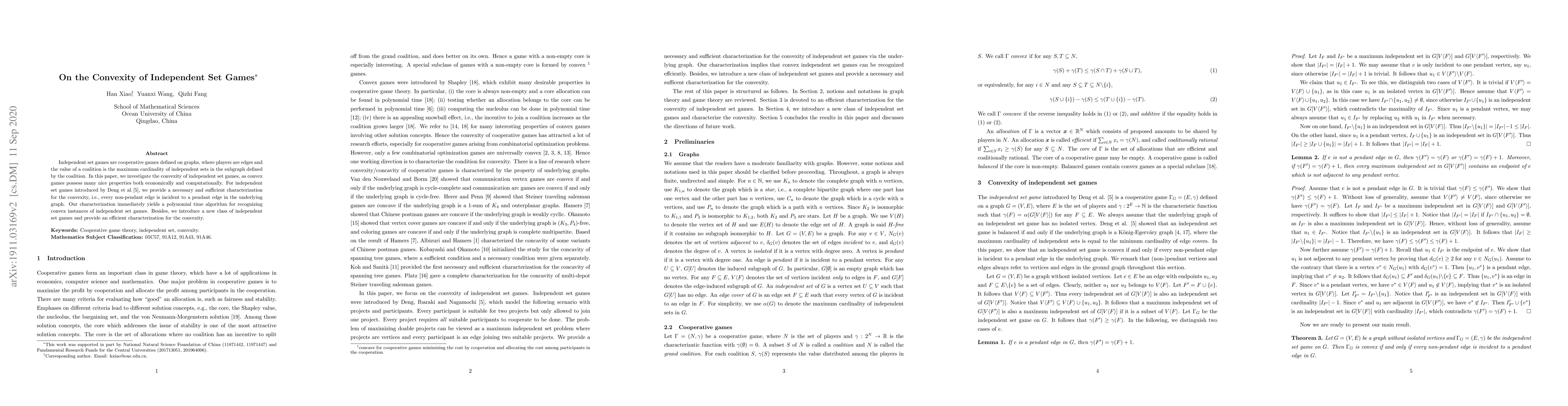 This paper investigates the convexity of independent set games on graphs, providing a necessary and sufficient condition for convexity: every non-pendant edge must be incident to a pendant edge. It also yields a polynomial time algorithm for recognizing convex instances and introduces a new class of independent set games with an efficient convexity characterization.