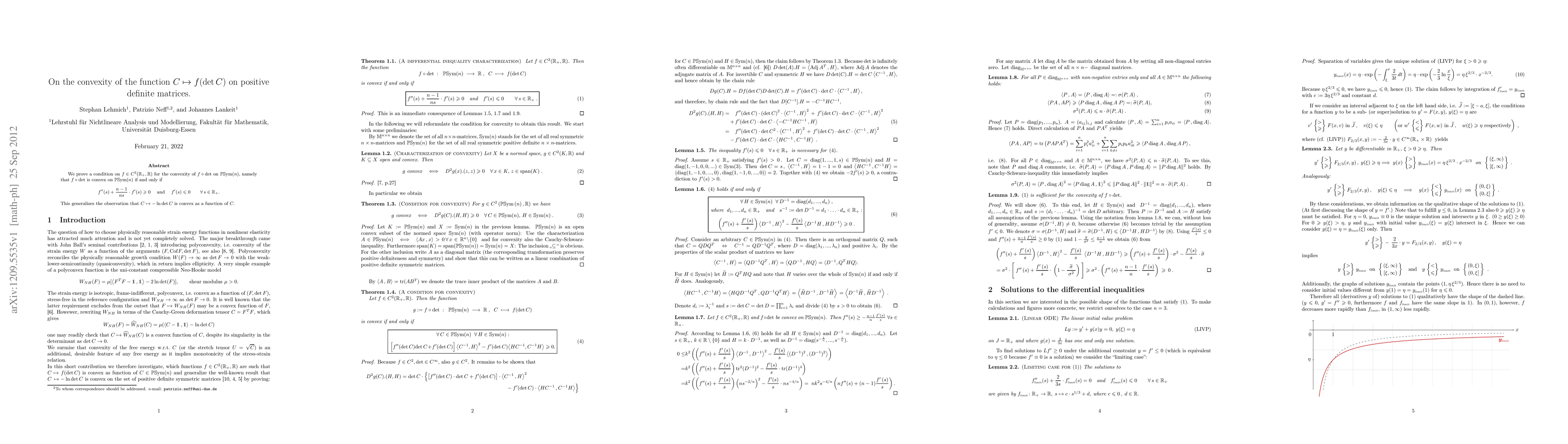We prove a condition on f \in C^2(\R+,\R) for the convexity of (f o det) on PSym(n), namely that f o det is convex on PSym(n) if and only if f"(s)+(n-1)/(ns) f'(s) >= 0 and f'(s)<= 0 \forall s \in \R+. This generalizes the observation that C --> -ln det C is convex as a function of C.