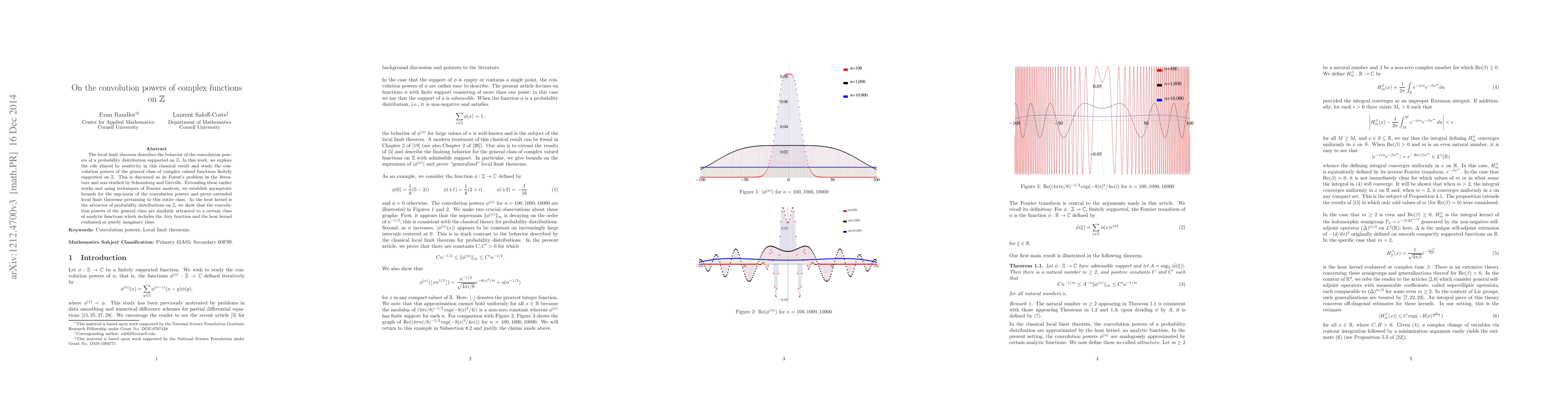 This paper investigates the behavior of convolution powers of complex functions on Z, extending classical results on the local limit theorem. Using Fourier analysis, it establishes asymptotic bounds for the convolution powers and proves extended local limit theorems for a general class of finitely supported functions, showing they converge to a class of analytic functions including the Airy function.