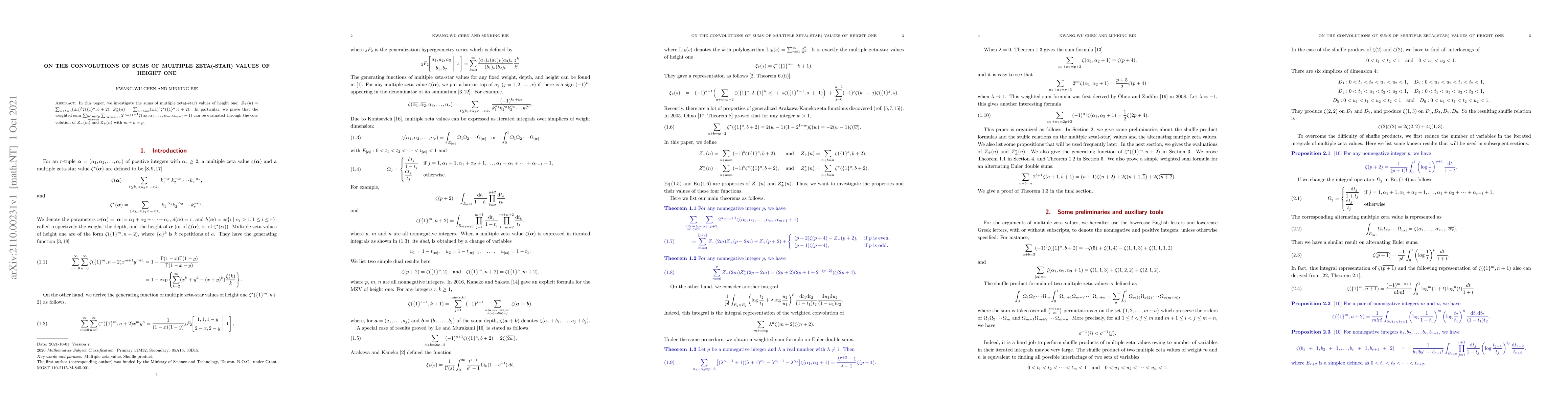 In this paper, we investigate the sums of mutliple zeta(-star) values of height one: $Z_{\pm}(n)=\sum_{a+b=n} (\pm 1)^b\zeta(\{1\}^a,b+2)$, $Z_{\pm}^{\star}(n)=\sum_{a+b=n} (\pm 1)^b\zeta^{\star}(\{1\}^a,b+2)$. In particular, we prove that the weighted sum $\sum_{\substack{0\leq m\leq p\\ m: {\rm even}}} \sum_{\mid\boldsymbol{\alpha}\mid=p+3} 2^{\alpha_{m+1}\ +1}\zeta(\alpha_0,\alpha_1,\ldots,\alpha_m,\alpha_{m+1}+1) $ can be evaluated through the convolution of $Z_{-}(m)$ and $Z_{+}(n)$ with $m+n=p$.