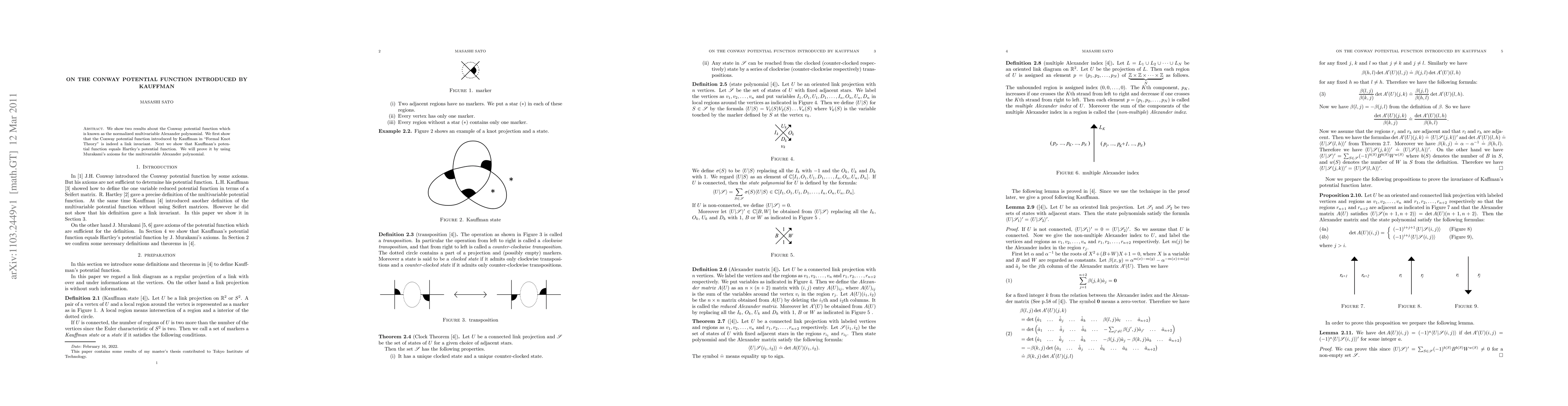 We show two results about the Conway potential function which is known as the normalized multivariable Alexander polynomial. We first show that the Conway potential function introduced by Kauffman in "Formal Knot Theory" is indeed a link invariant. Next we show that Kauffman's potential function equals Hartley's potential function. We will prove it by using Murakami's axioms for the multivariable Alexander polynomial.