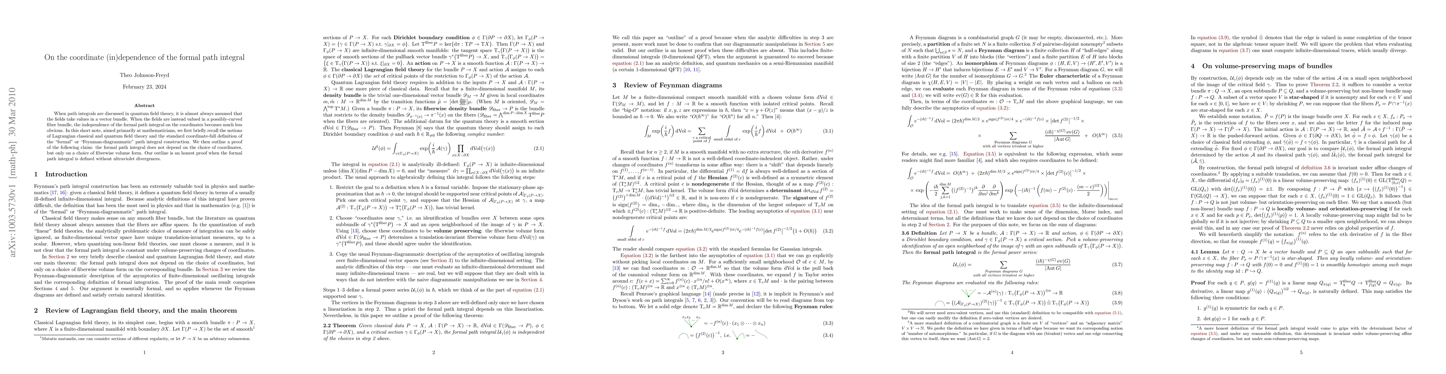 This paper demonstrates that the formal path integral in quantum field theory remains coordinate-independent when the fields are valued in a fiber bundle, depending only on a fiberwise volume form, provided the integral is well-defined without ultraviolet divergences. The authors provide a concise proof outline aimed at mathematicians.