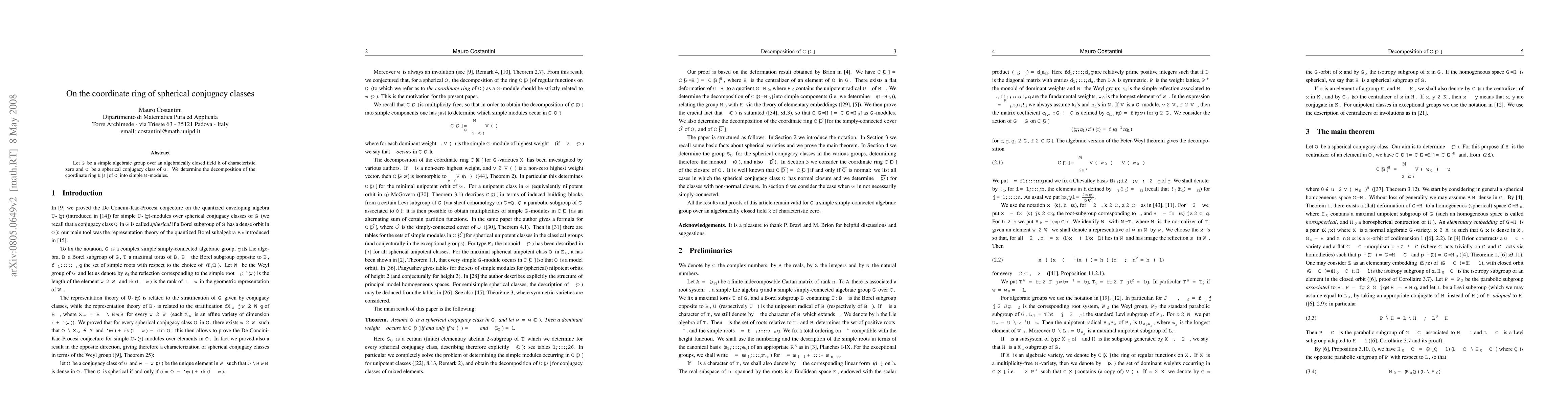 Let G be a simple algebraic group over an algebraically closed field of characteristic zero and X be a spherical conjugacy class of G. We determine the decomposition of the coordinate ring of X into simple G-modules.