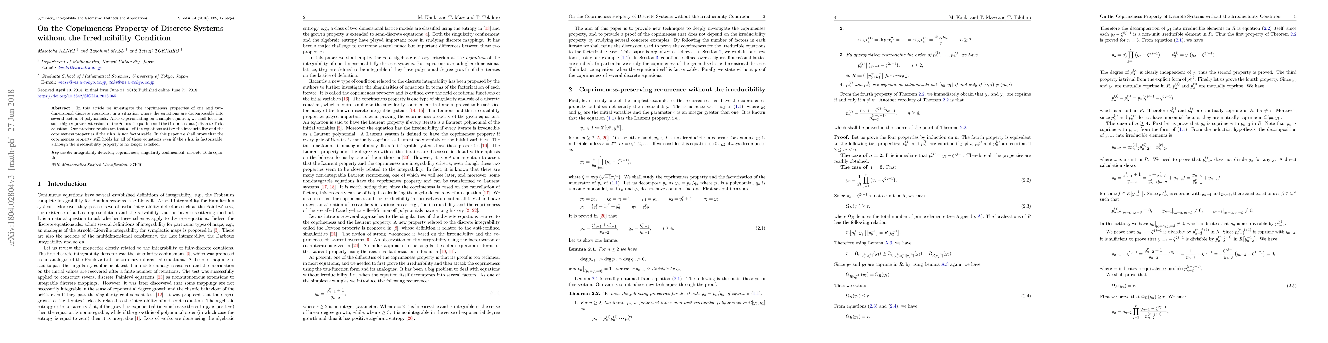This paper explores the coprimeness properties of discrete systems, specifically one and two-dimensional equations, even when they can be factored into polynomial components. It demonstrates that these systems maintain coprimeness despite factorization, contrasting with the loss of irreducibility, using extensions of the Somos-4 and discrete Toda equations as examples.