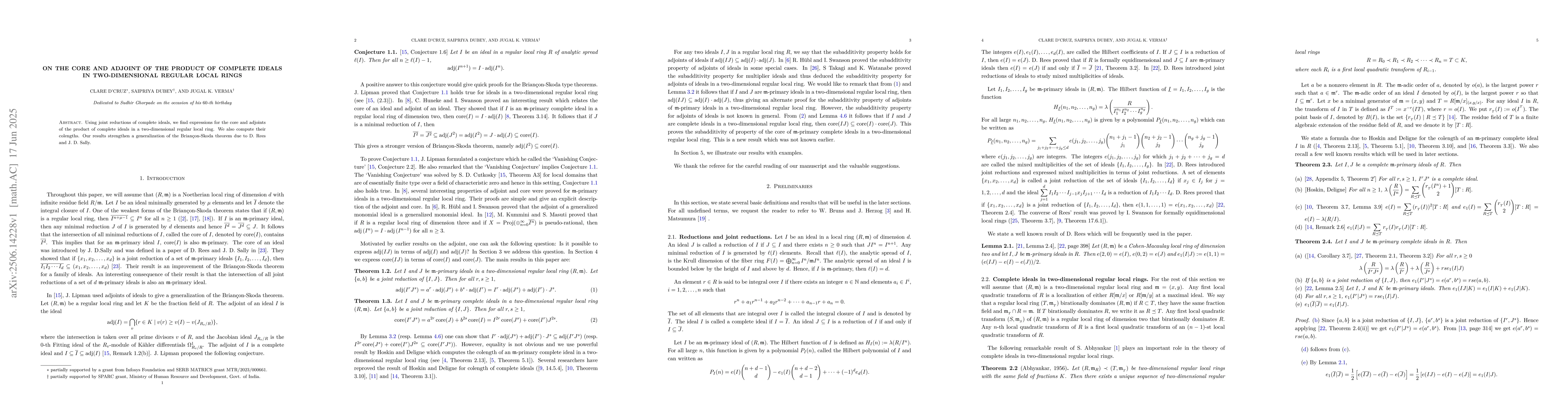 This paper presents expressions for the core and adjoints of the product of complete ideals in two-dimensional regular local rings using joint reduction techniques. It also calculates their colengths, reinforcing a Rees and Sally's generalization of the Brianc{c}on-Skoda theorem.
