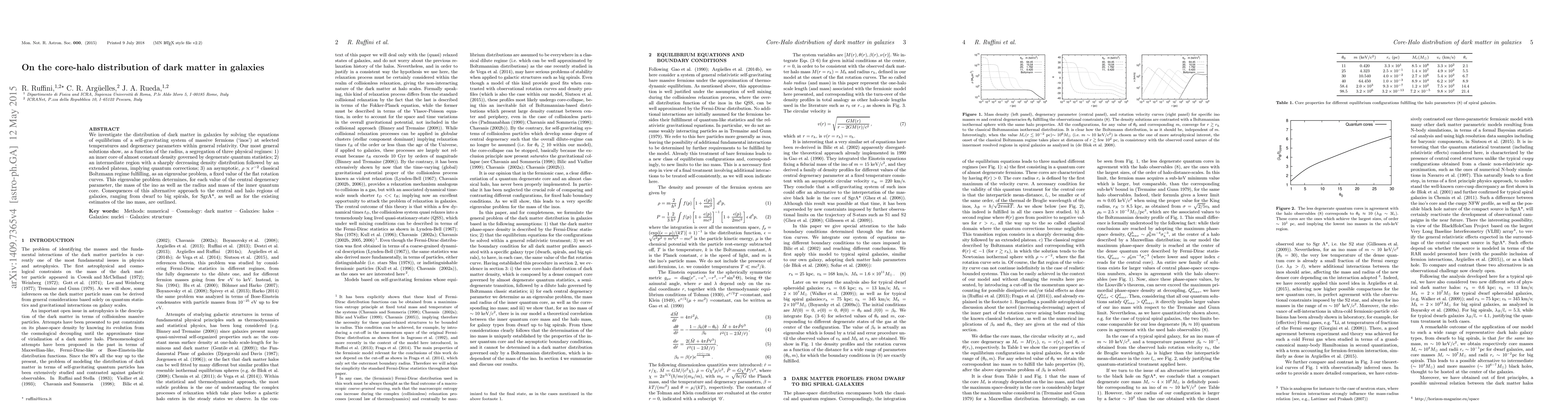 We investigate the distribution of dark matter in galaxies by solving the equations of equilibrium of a self-gravitating system of massive fermions (`inos') at selected temperatures and degeneracy parameters within general relativity. Our most general solutions show, as a function of the radius, a segregation of three physical regimes: 1) an inner core of almost constant density governed by degenerate quantum statistics; 2) an intermediate region with a sharply decreasing density distribution followed by an extended plateau, implying quantum corrections; 3) an asymptotic, $\rho\propto r^{-2}$ classical Boltzmann regime fulfilling, as an eigenvalue problem, a fixed value of the flat rotation curves. This eigenvalue problem determines, for each value of the central degeneracy parameter, the mass of the ino as well as the radius and mass of the inner quantum core. Consequences of this alternative approach to the central and halo regions of galaxies, ranging from dwarf to big spirals, for SgrA*, as well as for the existing estimates of the ino mass, are outlined.