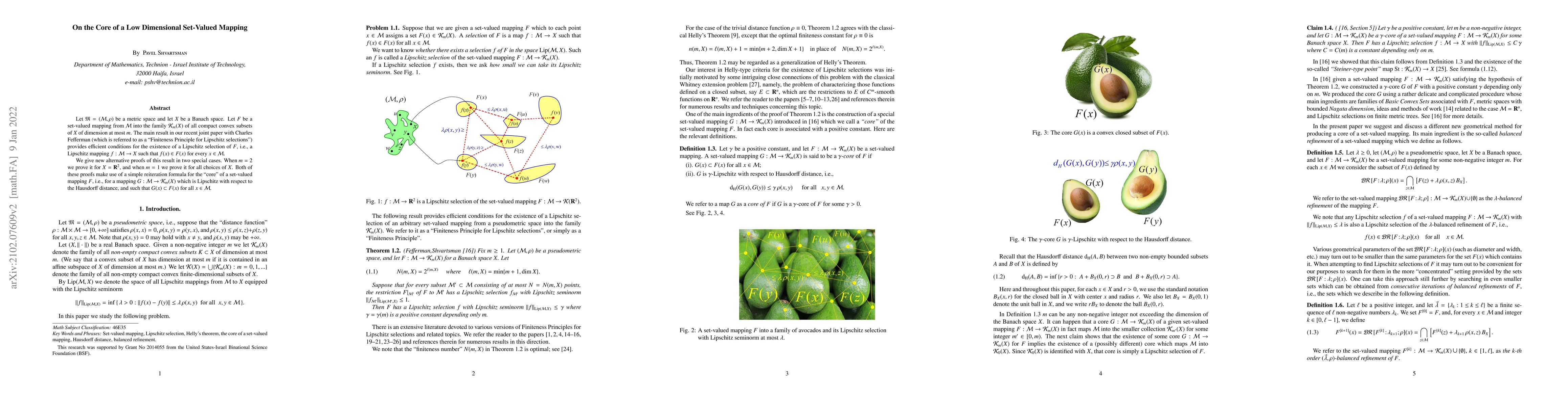 Let ${\mathfrak M}=({\mathcal M},\rho)$ be a metric space and let $X$ be a Banach space. Let $F$ be a set-valued mapping from ${\mathcal M}$ into the family ${\mathcal K}_m(X)$ of all compact convex subsets of $X$ of dimension at most $m$. The main result in our recent joint paper with Charles Fefferman (which is referred to as a "Finiteness Principle for Lipschitz selections") provides efficient conditions for the existence of a Lipschitz selection of $F$, i.e., a Lipschitz mapping $f:{\mathcal M}\to X$ such that $f(x)\in F(x)$ for every $x\in{\mathcal M}$. We give new alternative proofs of this result in two special cases. When $m=2$ we prove it for $X={\bf R}^{2}$, and when $m=1$ we prove it for all choices of $X$. Both of these proofs make use of a simple reiteration formula for the "core" of a set-valued mapping $F$, i.e., for a mapping $G:{\mathcal M}\to{\mathcal K}_m(X)$ which is Lipschitz with respect to the Hausdorff distance, and such that $G(x)\subset F(x)$ for all $x\in{\mathcal M}$.