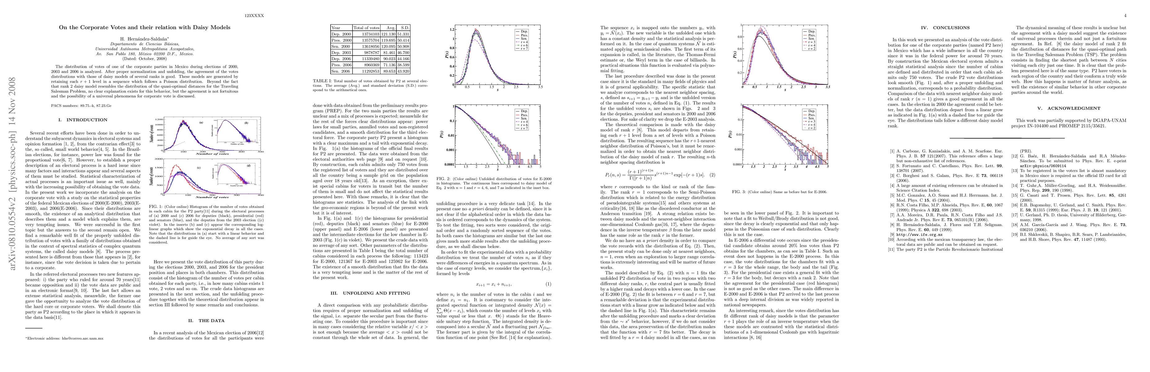 The distribution of votes of one of the corporate parties in Mexico during elections of 2000, 2003 and 2006 is analyzed. After proper normalization and unfolding the agreement of the votes distributions with those of daisy models of several ranks is good. These models are generated by retaining each $r+1$ level in a sequence which follows a Poisson distribution.Beyond the fact that rank 2 daisy model resembles the distribution of the quasi-optimal distances for the Traveling Salesman Problem no clear explanation exists for this behavior, but the agreement is not fortuitous and the possibility of a universal phenomena for corporate vote is discussed.