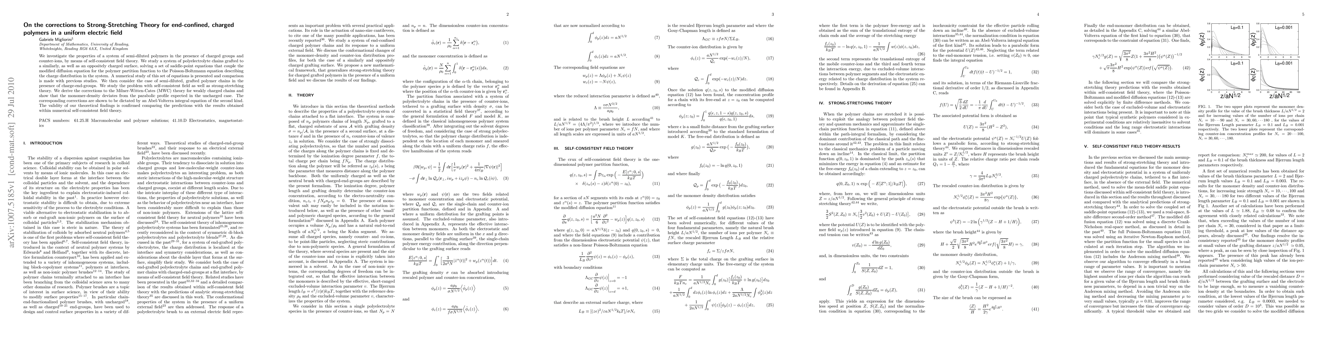 We investigate the properties of a system of semi-diluted polymers in the presence of charged groups and counter-ions, by means of self-consistent field theory. We study a system of polyelectrolyte chains grafted to a similarly, as well as an oppositely charged surface, solving a set of saddle-point equations that couple the modified diffusion equation for the polymer partition function to the Poisson-Boltzmann equation describing the charge distribution in the system. A numerical study of this set of equations is presented and comparison is made with previous studies. We then consider the case of semi-diluted, grafted polymer chains in the presence of charge-end-groups. We study the problem with self-consistent field as well as strong-stretching theory. We derive the corrections to the Milner-Witten-Cates (MWC) theory for weakly charged chains and show that the monomer-density deviates from the parabolic profile expected in the uncharged case. The corresponding corrections are shown to be dictated by an Abel-Volterra integral equation of the second kind. The validity of our theoretical findings is confirmed comparing the predictions with the results obtained within numerical self-consistent field theory.