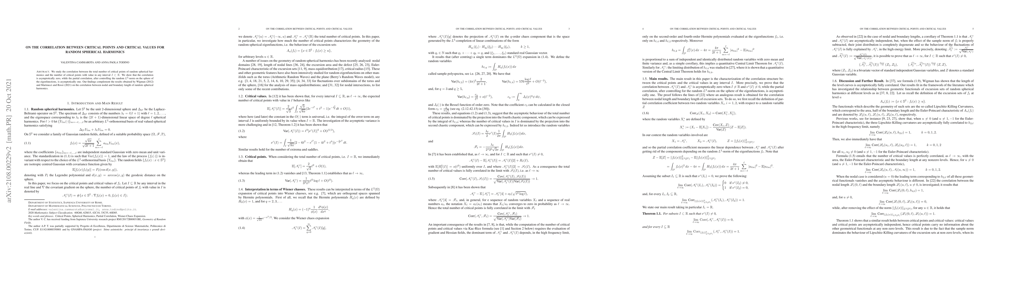 This paper investigates the correlation between the total number of critical points and critical values within intervals for random spherical harmonics, finding that the correlation tends to zero asymptotically, while the partial correlation, after adjusting for the $L^2$-norm, tends to one. These results extend previous findings on nodal and boundary length correlations.
