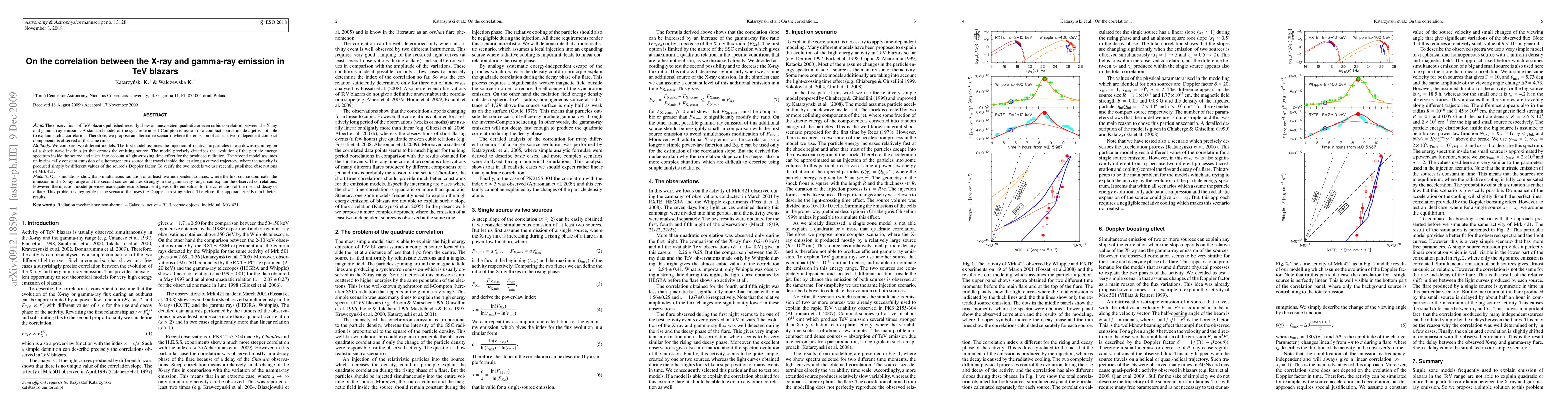 The observations of TeV blazars published recently show an unexpected quadratic or even cubic correlation between the X-ray and gamma-ray emission. A standard model of the synchrotron self-Compton emission of a compact source inside a jet is not able to explain such a correlation. Therefore, we propose an alternative scenario where the emission of at least two independent compact components is observed at the same time. We compare two different models. The first model assumes the injection of relativistic particles into a downstream region of a shock wave inside a jet that creates the emitting source. The model precisely describes the evolution of the particle energy spectrum inside the source and takes into account a light-crossing time effect for the produced radiation. The second model assumes an intrinsically constant emission of a homogeneous source that travels inside the jet along a curved trajectory, where the activity is produced simply by different values of the source's Doppler factor. To verify the two models we use recentlu published observations of Mrk 421. Our simulations show that simultaneous radiation of at least two independent sources, where the first source dominates the emission in the X-ray range and the second source radiates strongly in the gamma-ray range, can explain the observed correlations. However, the injection model provides inadequate results because it gives different values for the correlation of the rise and decay of a flare. This problem is negligible in the scenario that uses the Doppler boosting effect. Therefore, this approach yields much better results.