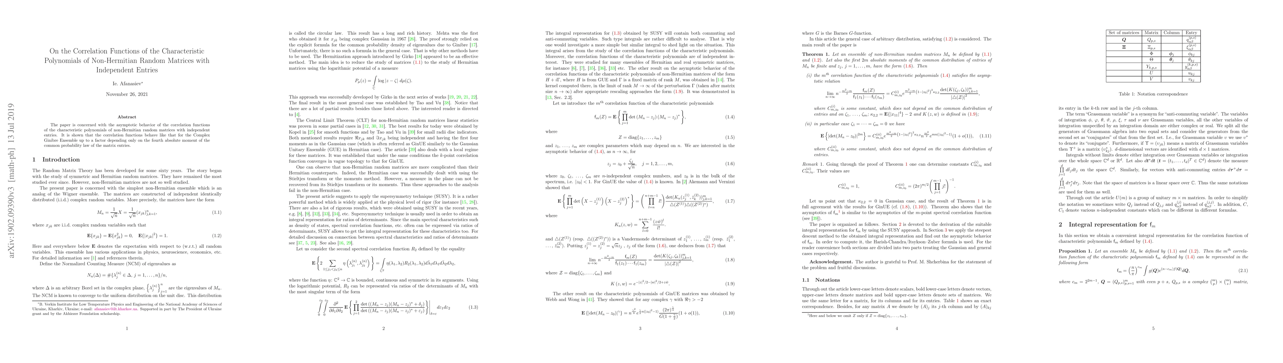 Summary: This paper investigates the asymptotic behavior of correlation functions for the characteristic polynomials of non-Hermitian random matrices with independent entries, revealing their similarity to the Complex Ginibre Ensemble, modulated by a factor tied to the fourth absolute moment of the matrix entries' probability distribution.