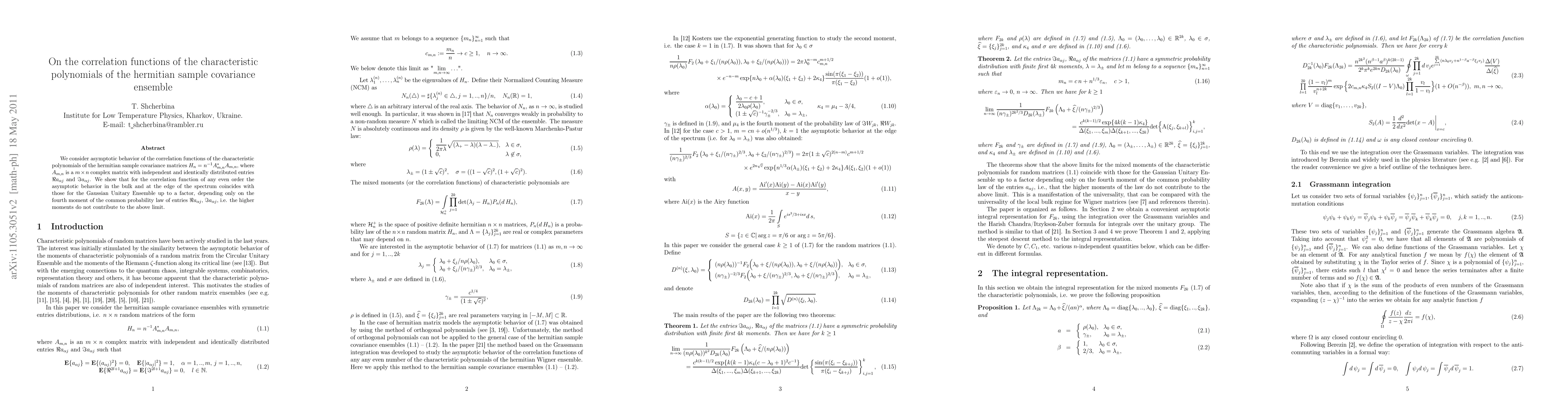 This paper investigates the asymptotic behavior of correlation functions of the characteristic polynomials of hermitian sample covariance matrices. It finds that the correlation functions of even order converge to those of the Gaussian Unitary Ensemble, with the convergence factor dependent only on the fourth moment of the matrix entries.