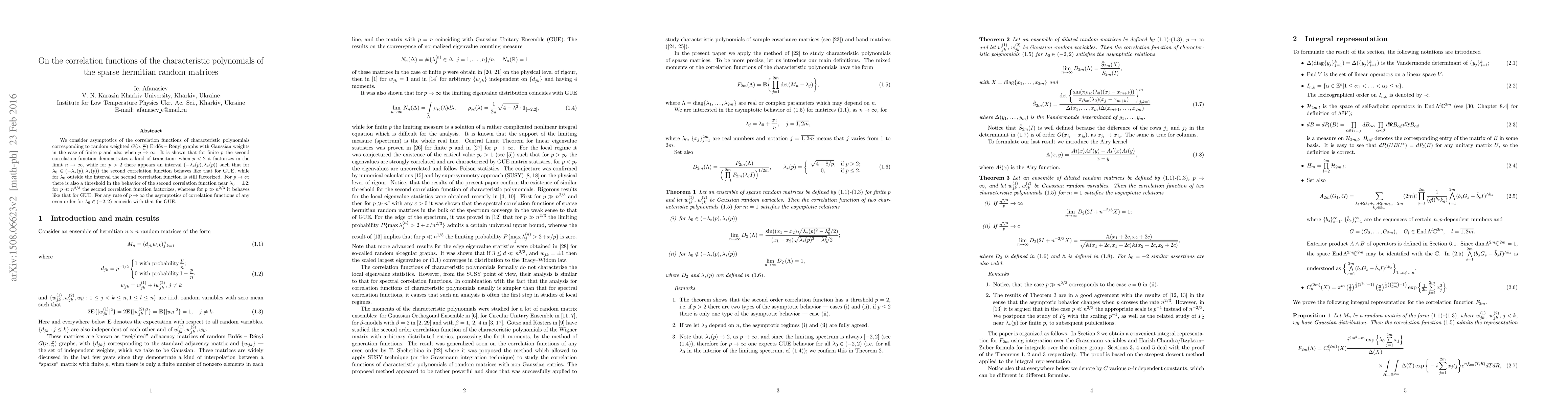 Research investigates the correlation functions of characteristic polynomials for sparse hermitian random matrices with Gaussian weights, showing a transition in behavior at certain thresholds as the number of nodes increases or the weight parameter changes.