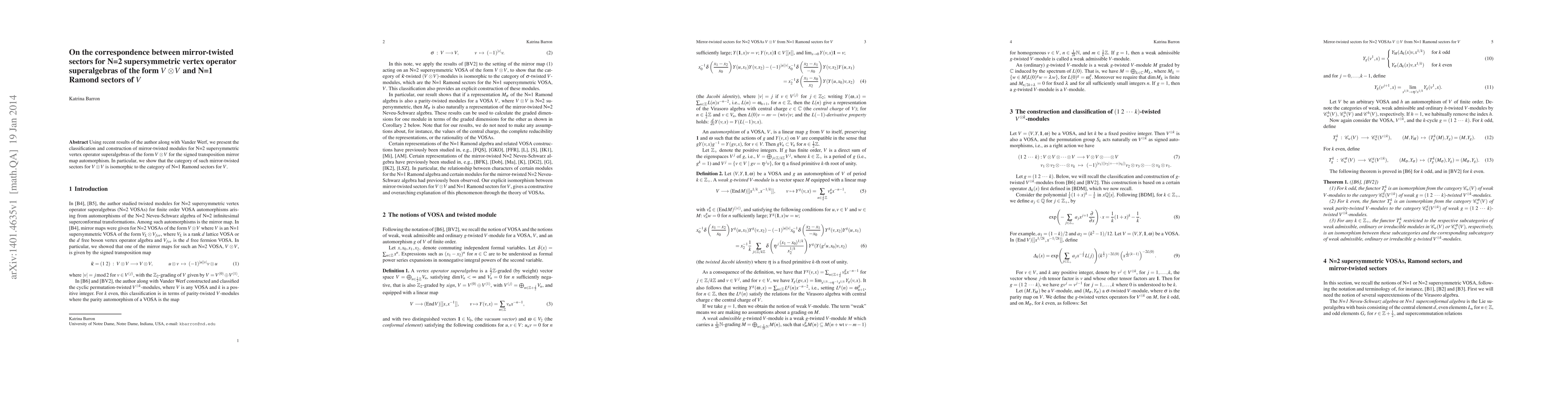 This paper classifies and constructs mirror-twisted modules for N=2 supersymmetric vertex operator superalgebras of the form $V \otimes V$ and demonstrates an isomorphism between their category and N=1 Ramond sectors of $V$.