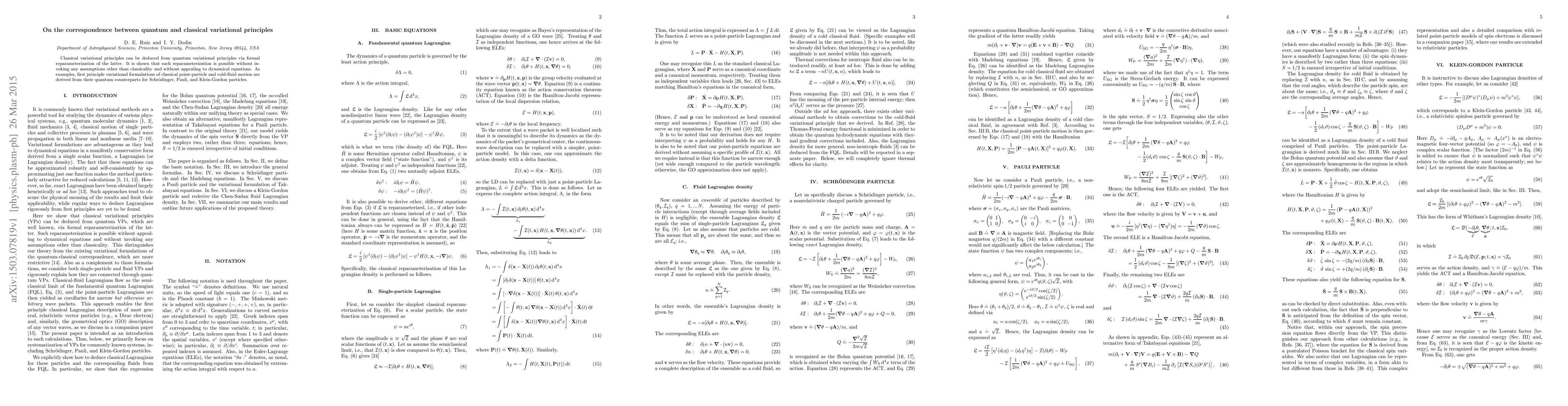 Classical variational principles can be deduced from quantum variational principles via formal reparameterization of the latter. It is shown that such reparameterization is possible without invoking any assumptions other than classicality and without appealing to dynamical equations. As examples, first principle variational formulations of classical point-particle and cold-fluid motion are derived from their quantum counterparts for Schrodinger, Pauli, and Klein-Gordon particles.