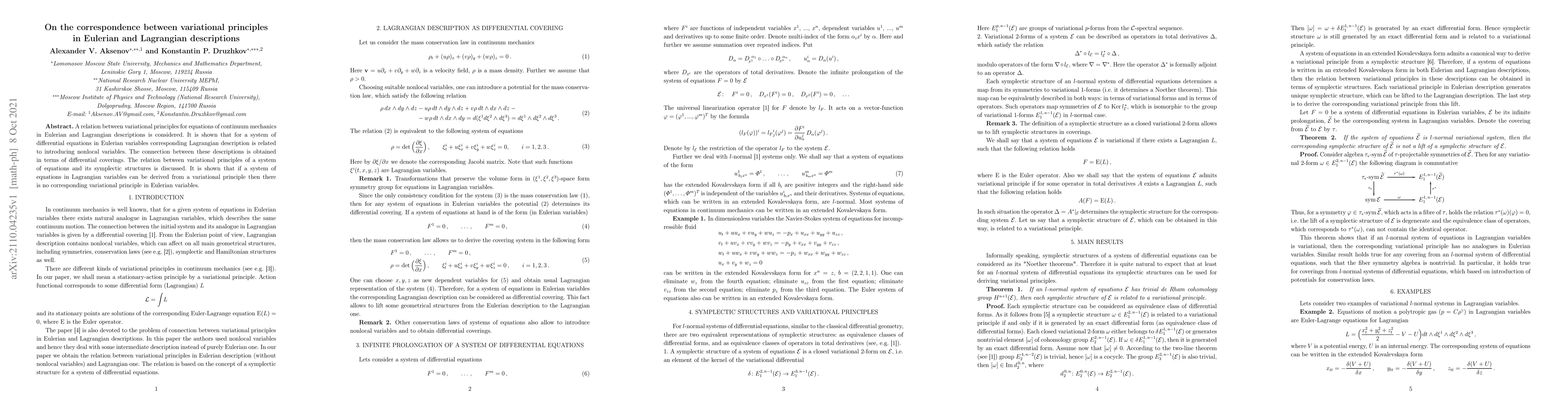 This paper explores the correspondence between variational principles in Eulerian and Lagrangian descriptions of continuum mechanics, demonstrating that the Lagrangian formulation can be linked to nonlocal variables through differential coverings. It concludes that while Lagrangian systems can be derived from variational principles, no such variational principle exists for their Eulerian counterparts.