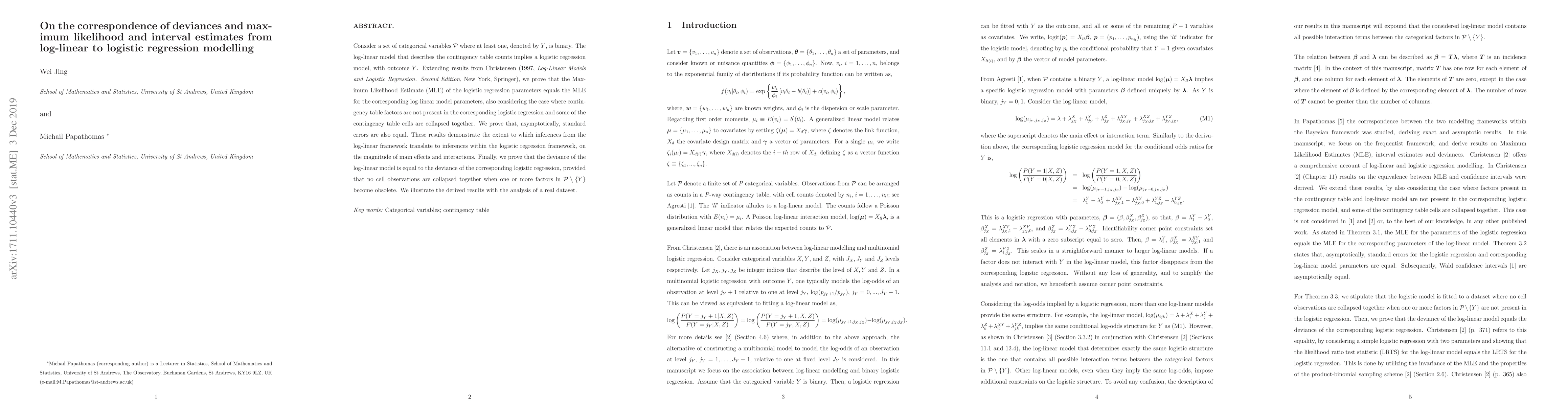 This paper demonstrates that Maximum Likelihood Estimates (MLE) and their asymptotic standard errors from log-linear models correspond to those from logistic regression models, particularly when factors in the contingency table are appropriately handled. It also proves that the deviances of these models are equal under specific conditions.