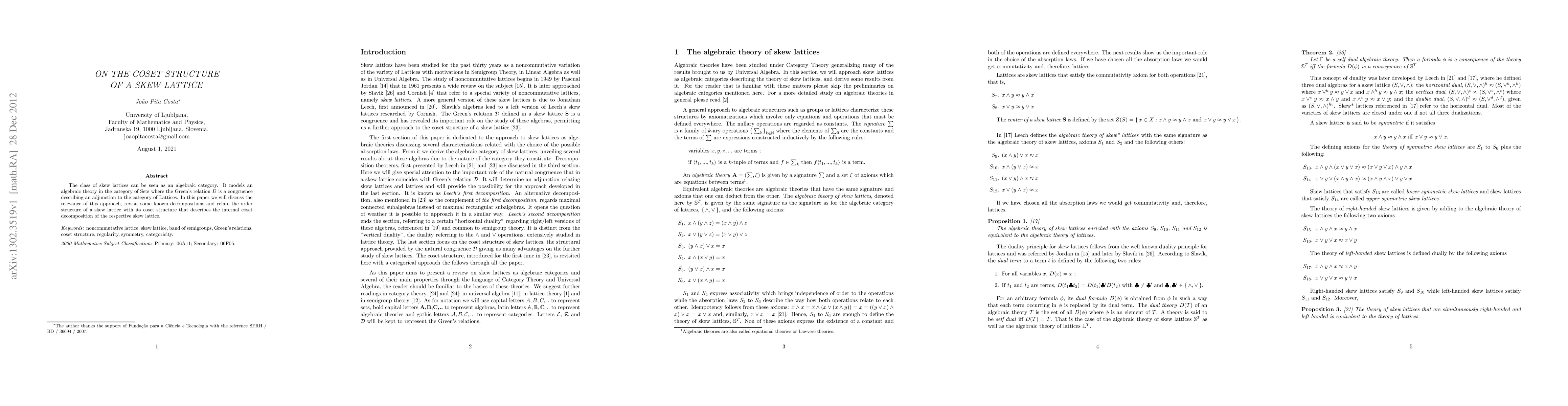 This paper explores the algebraic theory of skew lattices within the category of Sets, focusing on the Green's relation D as a congruence and its adjunction to the category of Lattices. It examines the coset structure and its connection to the order structure in skew lattices.