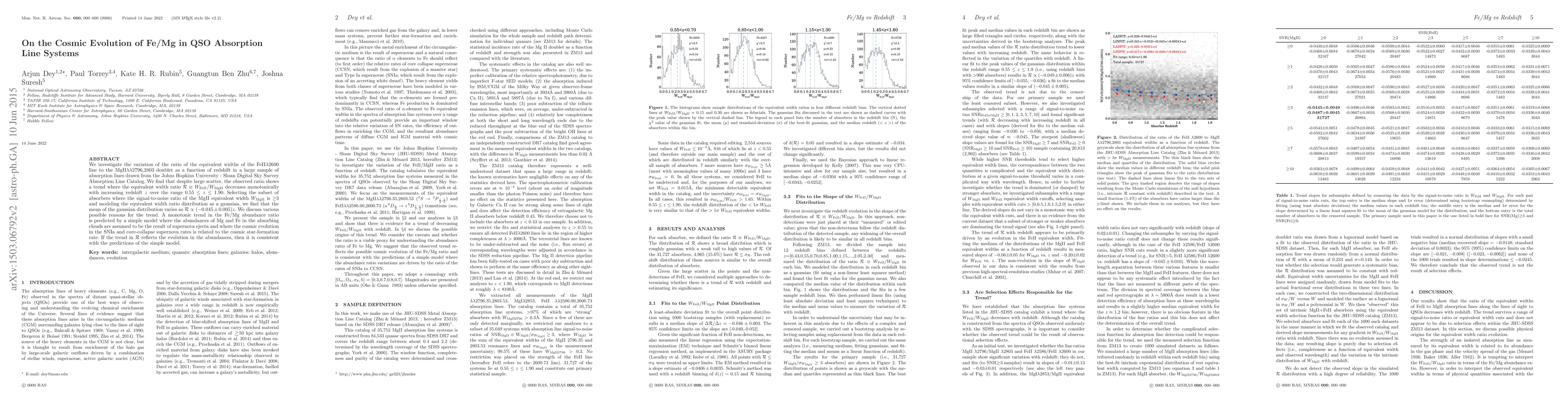 This paper investigates the cosmic evolution of the Fe/Mg ratio in quasar absorption line systems, finding a monotonic decrease in the FeII/MgII equivalent width ratio with increasing redshift. The study suggests that this trend aligns with a simple model predicting the evolution of supernova rates linked to the cosmic star-formation rate.