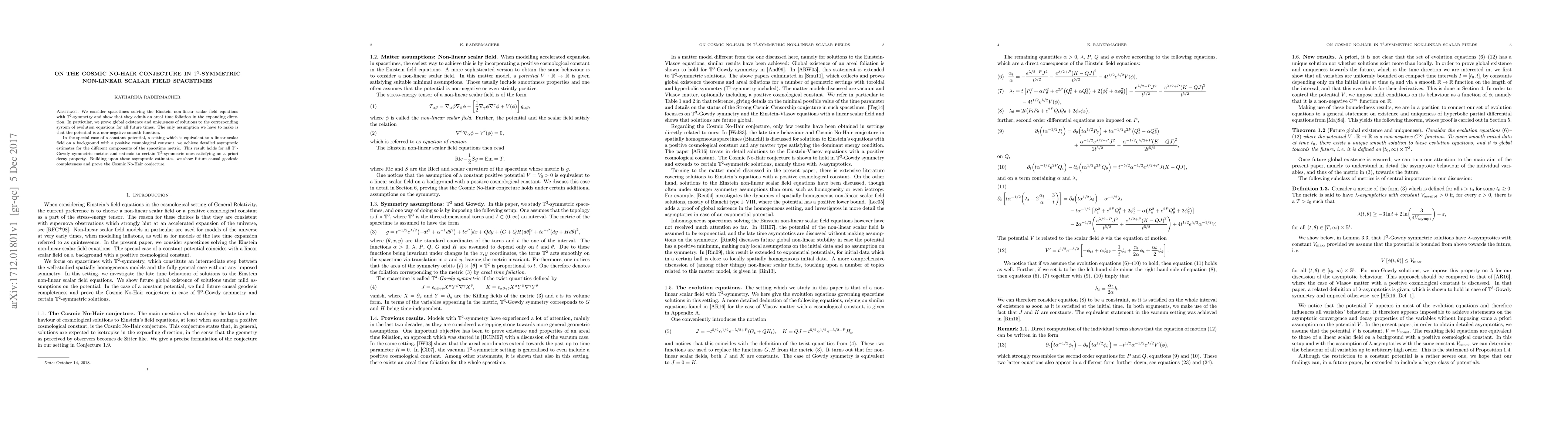 Researchers prove the Cosmic No-Hair Conjecture in T2-symmetric spacetimes, showing global existence and uniqueness of solutions to evolution equations for all future times with no assumptions on the potential function.