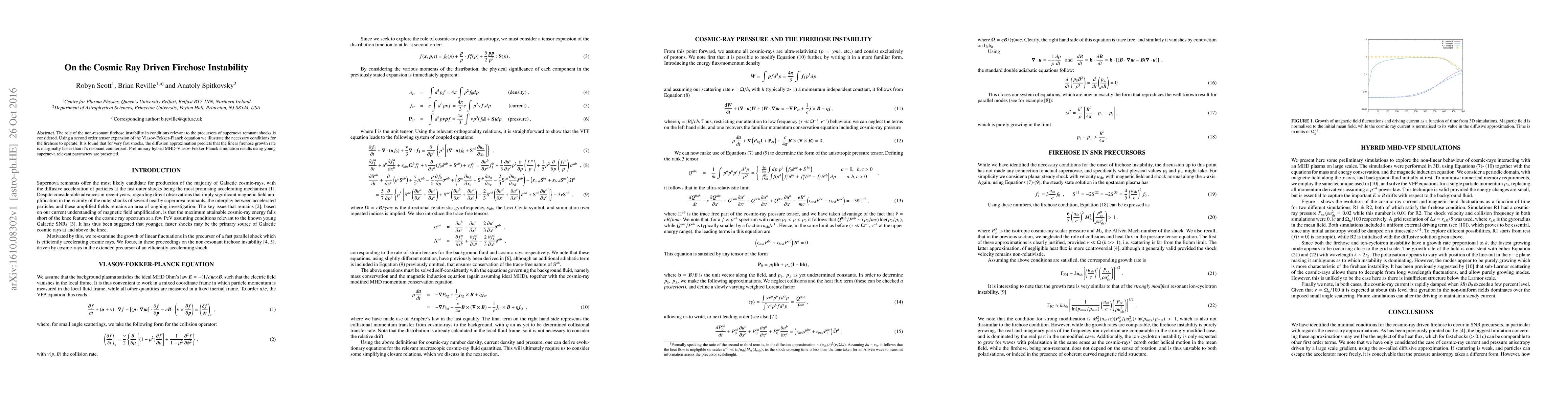 This paper investigates the non-resonant firehose instability in the context of supernova remnants, showing that for very fast shocks, the diffusion approximation suggests the linear firehose growth rate is marginally faster than its resonant counterpart. Preliminary hybrid MHD-Vlasov-Fokker-Planck simulations with young supernova parameters support these findings.