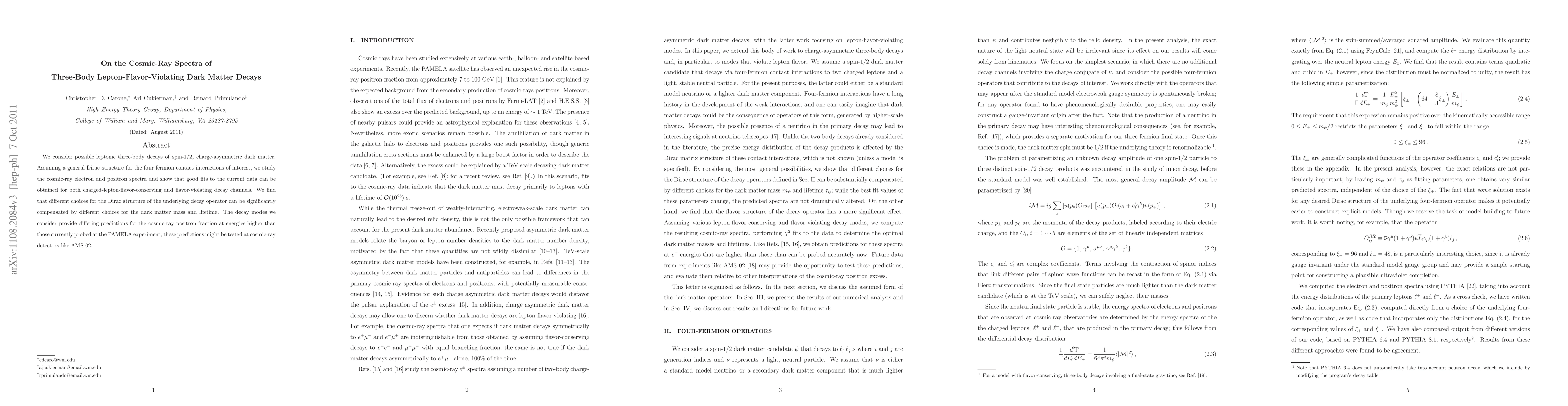 This paper investigates cosmic-ray spectra from three-body decays of spin-1/2 charge-asymmetric dark matter, considering both lepton-flavor-conserving and -violating scenarios. It finds that varying the decay operator's Dirac structure can be offset by changes in dark matter mass and lifetime, with predictions for high-energy positron fractions that may be tested by future cosmic-ray detectors.
