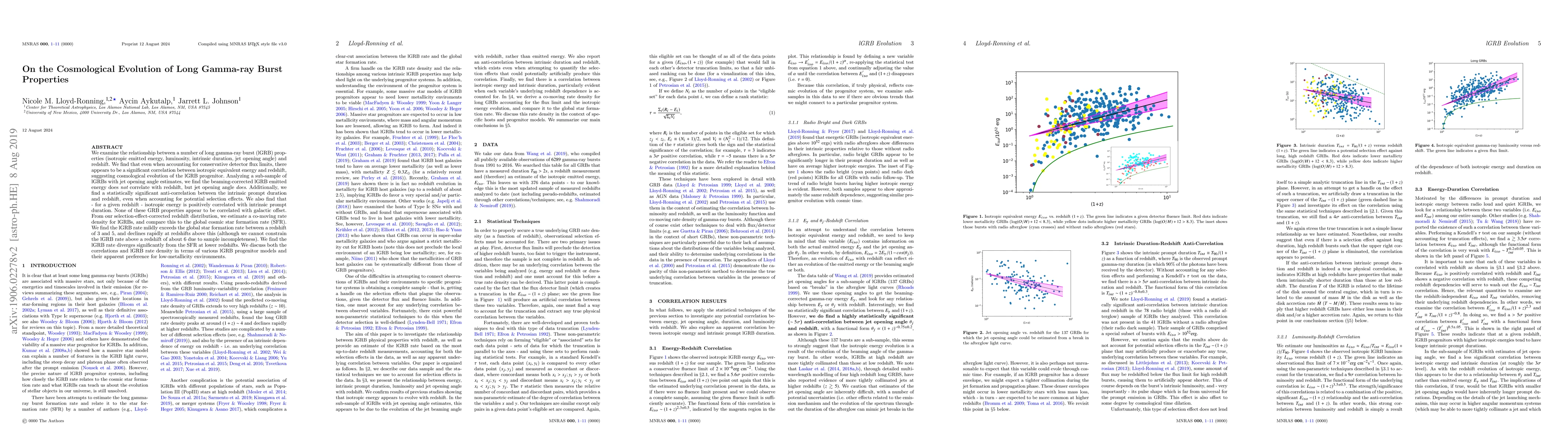 We examine the relationship between a number of long gamma-ray burst (lGRB) properties (isotropic emitted energy, luminosity, intrinsic duration, jet opening angle) and redshift. We find that even when accounting for conservative detector flux limits, there appears to be a significant correlation between isotropic equivalent energy and redshift, suggesting cosmological evolution of the lGRB progenitor. Analyzing a sub-sample of lGRBs with jet opening angle estimates, we find the beaming-corrected lGRB emitted energy does not correlate with redshift, but jet opening angle does. Additionally, we find a statistically significant anti-correlation between the intrinsic prompt duration and redshift, even when accounting for potential selection effects. We also find that - for a given redshift - isotropic energy is positively correlated with intrinsic prompt duration. None of these GRB properties appear to be correlated with galactic offset. From our selection-effect-corrected redshift distribution, we estimate a co-moving rate density for lGRBs, and compare this to the global cosmic star formation rate (SFR). We find the lGRB rate mildly exceeds the global star formation rate between a redshift of 3 and 5, and declines rapidly at redshifts above this (although we cannot constrain the lGRB rate above a redshift of about 6 due to sample incompleteness). We find the lGRB rate diverges significantly from the SFR at lower redshifts. We discuss both the correlations and lGRB rate density in terms of various lGRB progenitor models and their apparent preference for low-metallicity environments.