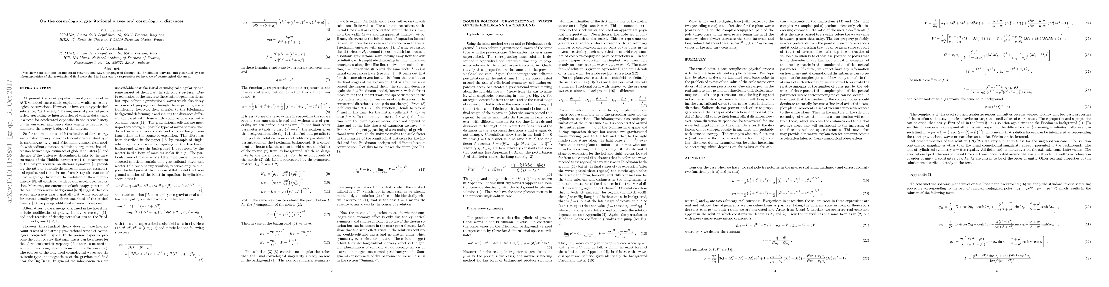 We show that solitonic cosmological gravitational waves propagated through the Friedmann universe and generated by the inhomogeneities of the gravitational field near the Big Bang can be responsible for increase of cosmological distances.