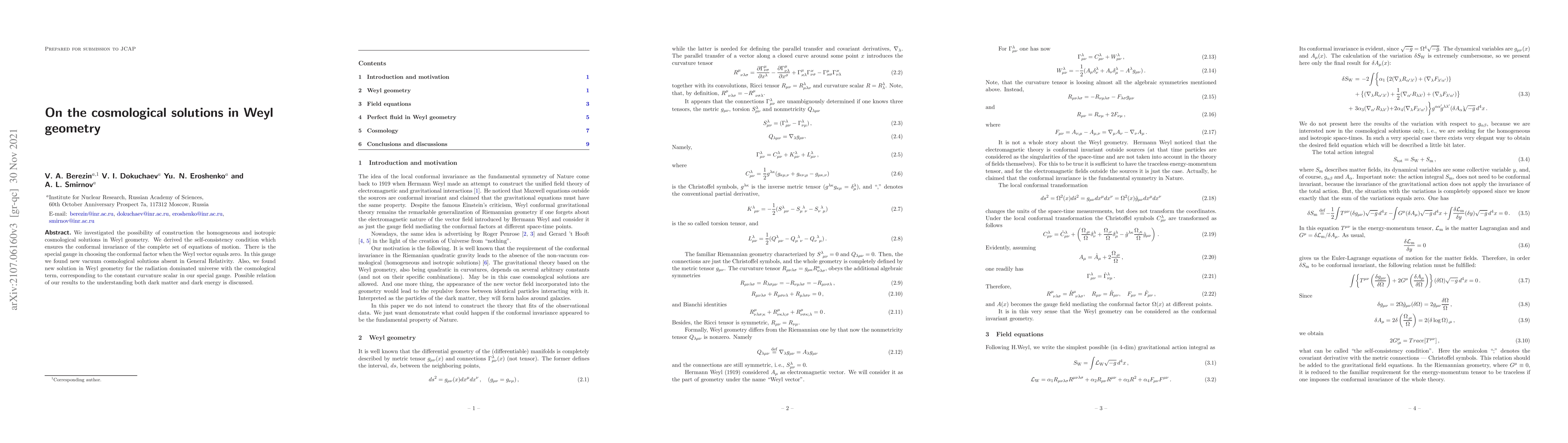 This paper explores homogeneous and isotropic cosmological solutions in Weyl geometry, deriving a self-consistency condition for conformal invariance. It identifies new vacuum solutions and a radiation-dominated universe solution in this geometry, potentially offering insights into dark matter and dark energy.