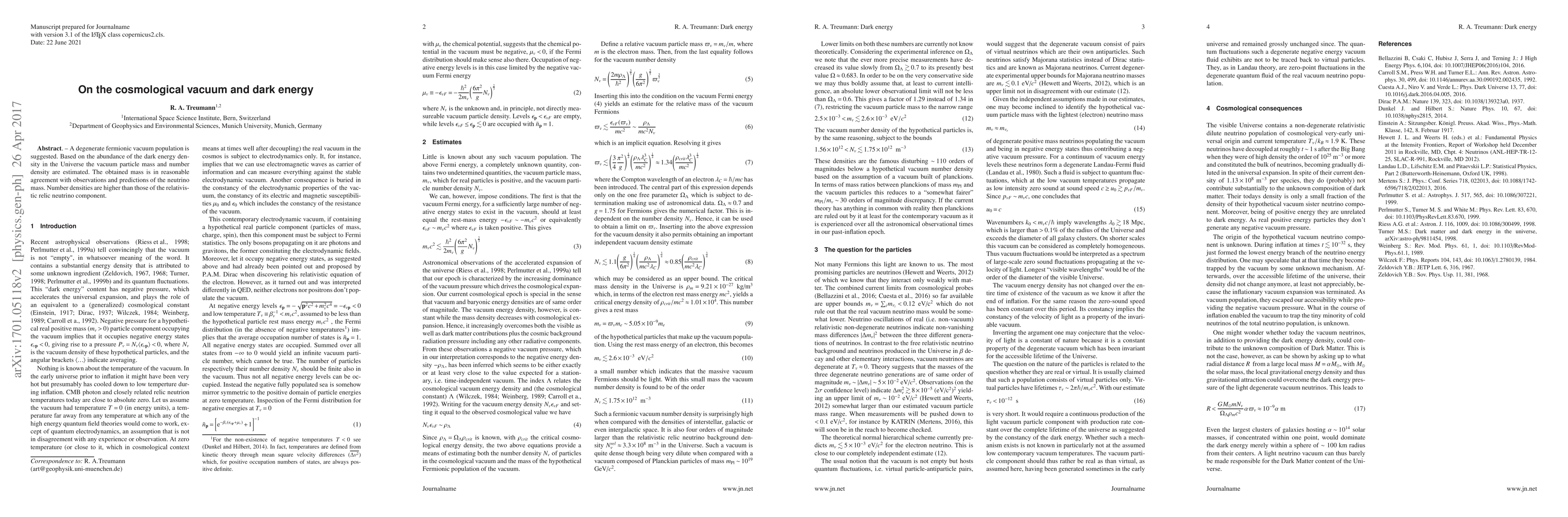 A degenerate fermionic vacuum population is suggested. Based on the abundance of the dark energy density in the Universe the vacuum particle mass and number density are estimated. The obtained mass is in reasonable agreement with observations and predictions of the neutrino mass. Number densities are higher than those of the relativistic relic neutrino component.