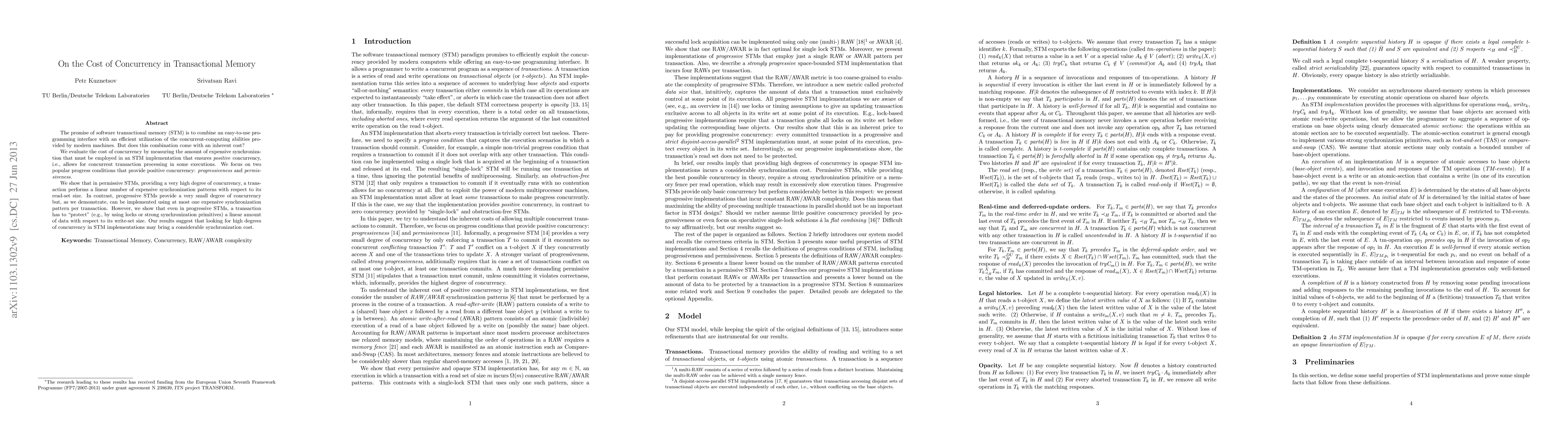 This paper evaluates the synchronization costs in software transactional memory (STM) implementations, finding that permissive STMs incur linear synchronization overhead with read-set size, while progressive STMs limit synchronization to one pattern per transaction but require protecting a linear amount of data based on the write-set size.