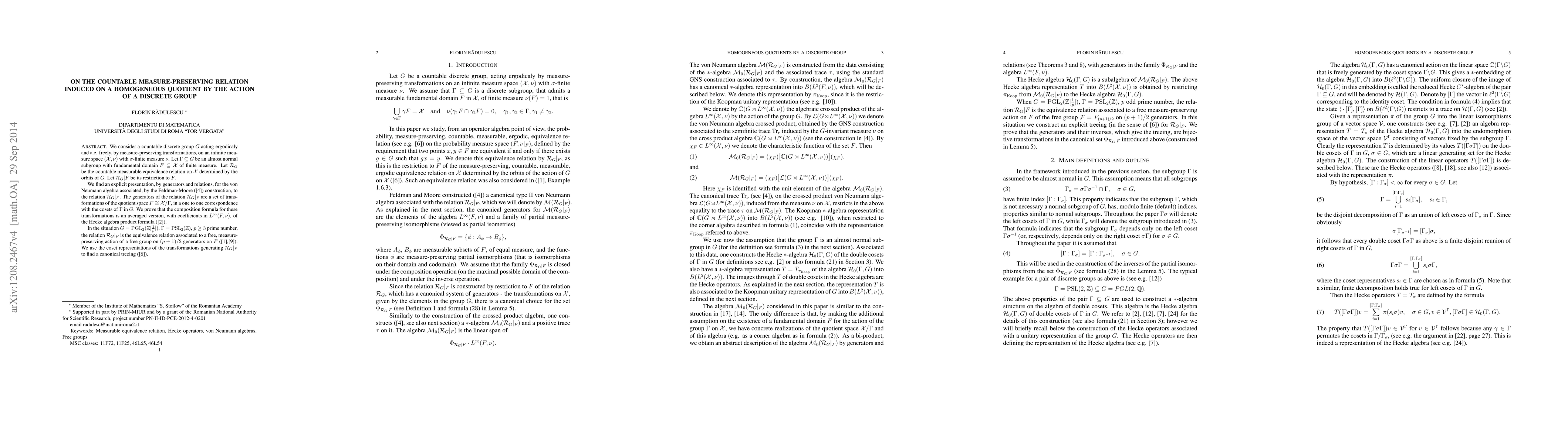 We consider a countable discrete group $G$ acting ergodicaly and a.e. freely, by measure-preserving transformations, on an infinite measure space $(\mathcal X,\nu)$ with $\sigma$-finite measure $\nu$. Let $\Gamma \subseteq G$ be an almost normal subgroup with fundamental domain $F\subseteq \mathcal X $ of finite measure. Let $\mathcal R_G$ be the countable measurable equivalence relation on $\mathcal X$ determined by the orbits of $G$. Let $\mathcal R_G| F$ be its restriction to $F$. We find an explicit presentation, by generators and relations, for the von Neumann algebra associated, by the Feldman-Moore (\cite{FM}) construction, to the relation $\mathcal R_G|_F$. The generators of the relation $\mathcal R_G|_F$ are a set of transformations of the quotient space $F\cong \mathcal X/ \Gamma$, in a one to one correspondence with the cosets of $\Gamma$ in $G$. We prove that the composition formula for these transformations is an averaged version, with coefficients in $L^\infty(F,\nu)$, of the Hecke algebra product formula (\cite{BC}). In the situation $G = PGL_2(\mathbb Z[\frac1p])$, $\Gamma=PSL_2(\mathbb Z)$, $p\geq 3$ prime number, the relation $\mathcal R_G|_F$ is the equivalence relation associated to a free, measure-preserving action of a free group on $(p+1)/2$ generators on $F$ (\cite{Ad},\cite {Hj}). We use the coset representations of the transformations generating $\mathcal R_G|_F$ to find a canonical treeing (\cite{Ga}).