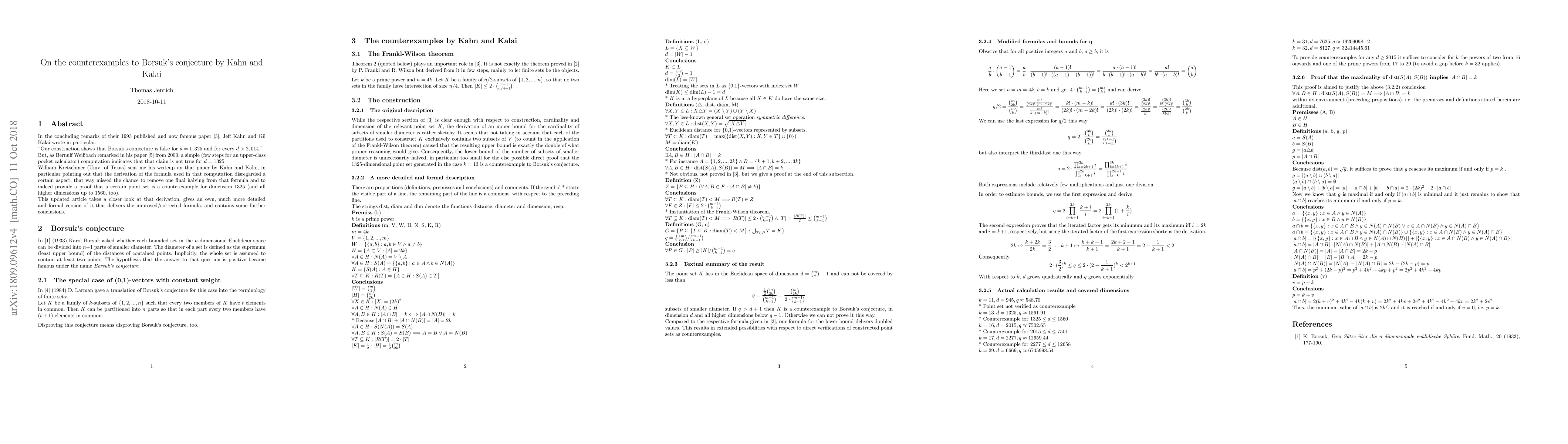 In the concluding remarks of their 1993 published and now famous paper, Jeff Kahn and Gil Kalai wrote in particular: "Our construction shows that Borsuk's conjecture is false for d = 1,325 and for every d > 2,014." But, as Bernulf Weiszbach remarked in his paper from 2000, a simple (few steps for an upper-class pocket calculator) computation indicates that that claim is not true for d=1325. William Kretschmer (Univ. of Texas) sent me his writeup on that paper by Kahn and Kalai, in particular pointing out that the derivation of the formula used in that computation disregarded a certain aspect, that way missed the chance to remove one final halving from that formula and to indeed provide a proof that a certain point set is a counterexample for dimension 1325 (and all higher dimensions up to 1560, too). This updated article takes a closer look at that derivation, gives an own, much more detailed and formal version of it that delivers the improved/corrected formula, and contains some further conclusions.