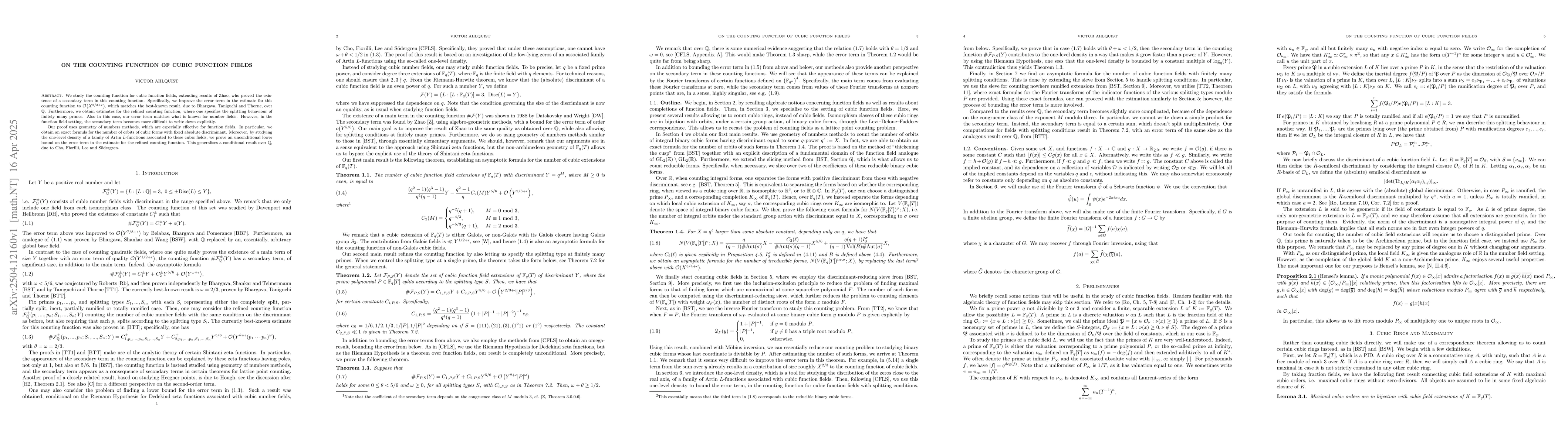 The research employs geometry of numbers methods, which are particularly effective for function fields, to study the counting function for cubic function fields. The proof involves obtaining an exact formula for the number of orbits of cubic forms with fixed absolute discriminant and studying the one-level density of a family of Artin L-functions associated with these cubic fields.