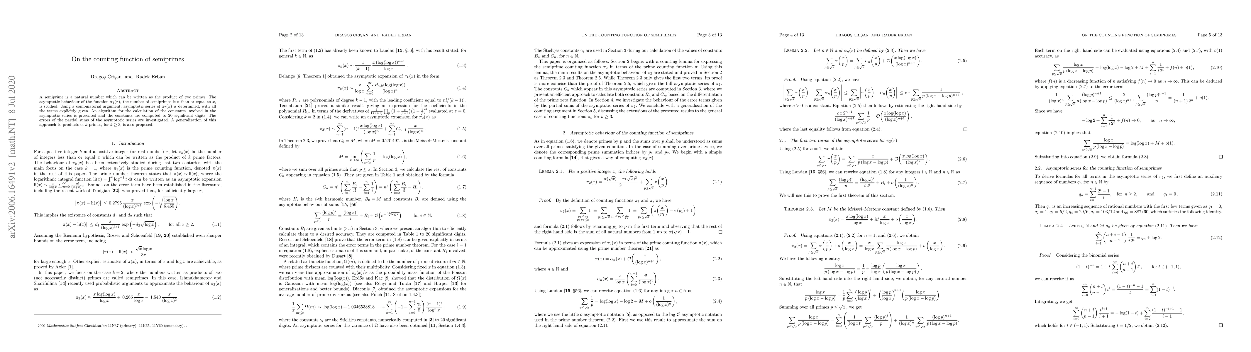 A semiprime is a natural number which can be written as the product of two primes. The asymptotic behaviour of the function $\pi_2(x)$, the number of semiprimes less than or equal to $x$, is studied. Using a combinatorial argument, asymptotic series of $\pi_2(x)$ is determined, with all the terms explicitly given. An algorithm for the calculation of the constants involved in the asymptotic series is presented and the constants are computed to 20 significant digits. The errors of the partial sums of the asymptotic series are investigated. A generalization of this approach to products of $k$ primes, for $k\geq 3$, is also proposed.