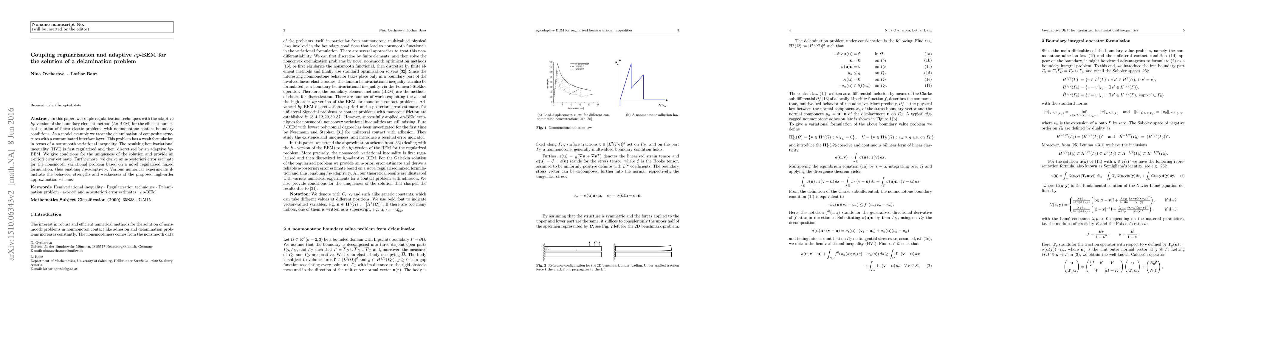 This paper combines regularization techniques with the adaptive $hp$-version of the boundary element method to solve a hemivariational inequality modeling delamination in composite structures. It provides conditions for solution uniqueness, an a-priori error estimate, and a novel a-posteriori error estimate, demonstrating the method's effectiveness through numerical experiments.
